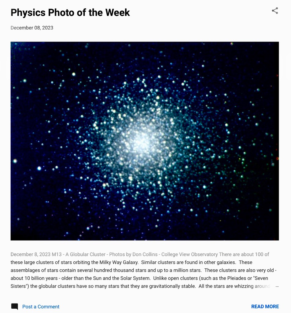 This is a response to my next door neighbor, Don Collins, who built an observatory In his back yard which houses a powerful telescope hooked to a computer which allows him to explore the universe on clear nights. Once a week Don posts a Physics Photo of the Week of some scientific phenomenom, either here on earth or at the end of the universe which he then explains to people like me who have little idea how the physical world functions. This week he put on a photograph of a star cluster 20,000 light years away that has hundreds of thousands of stars packed densely together whizzing around. If our solar system were in the middle of all of this it would be torn apart by random stars flying by.