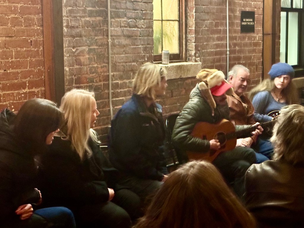 Last night I joined Susie at the Old Marshall Jail, now a hotel and eatery in Marshall, where we sat outside in an area sheltered by clear plastic walls with propane heaters every ten feet to make it cozy. and We listened to traditional folk singing, mountain ballads and stories. I thought one woman was going to sing, but along wall there were ten people, mostly women, who took turns singing old time Madison County folk songs.