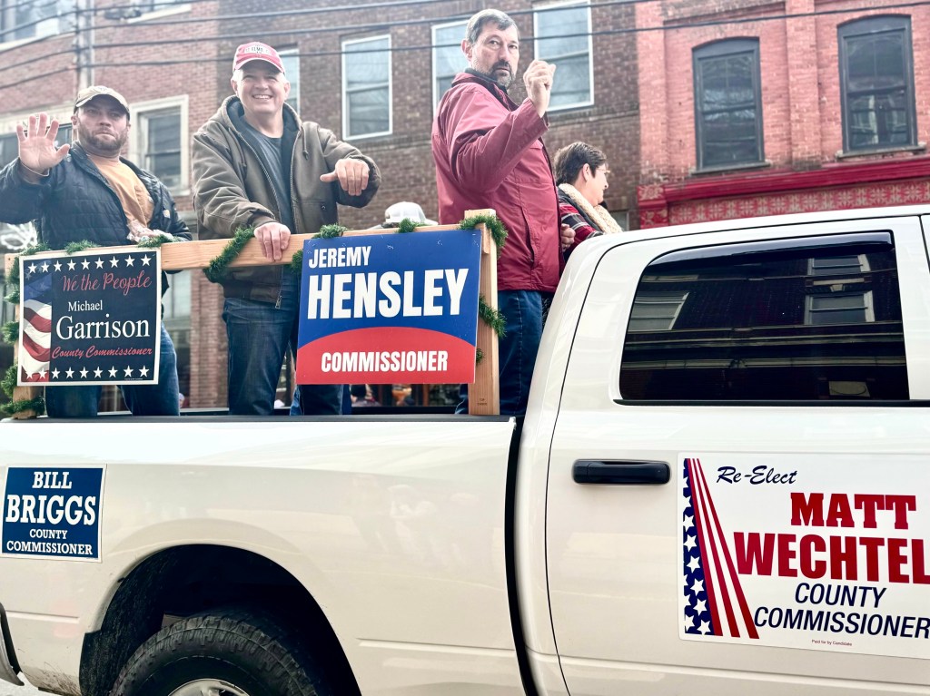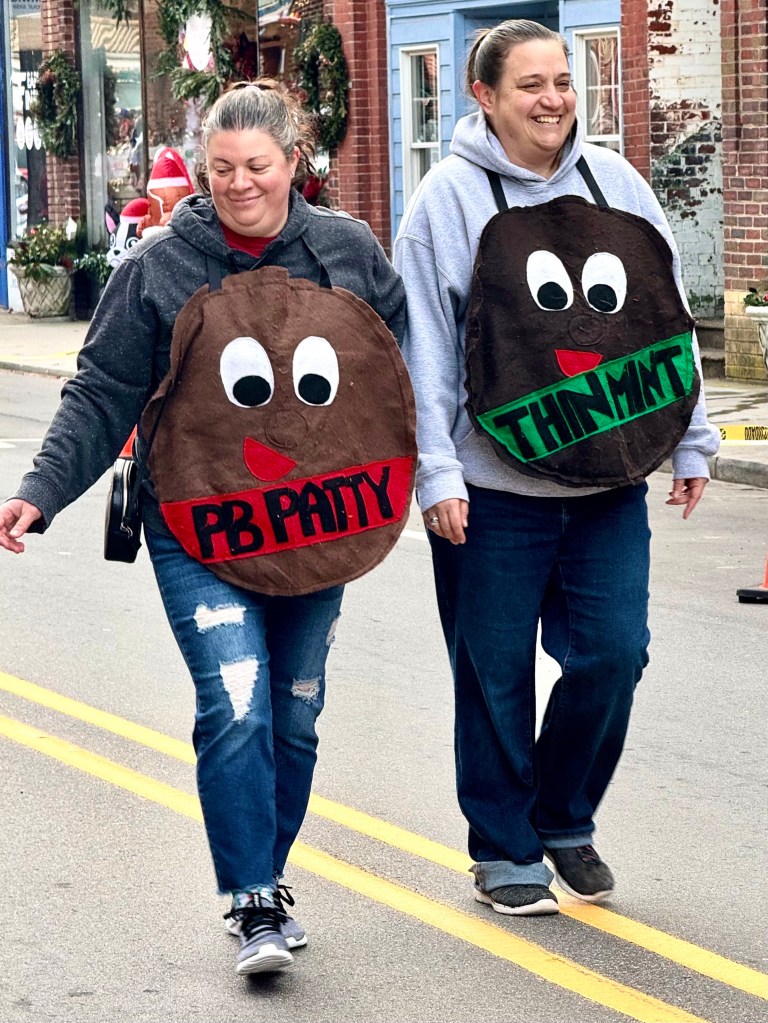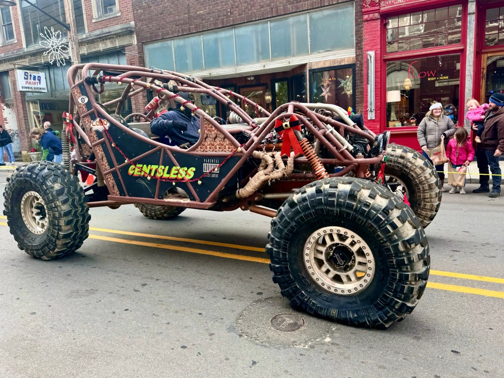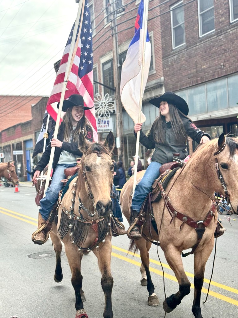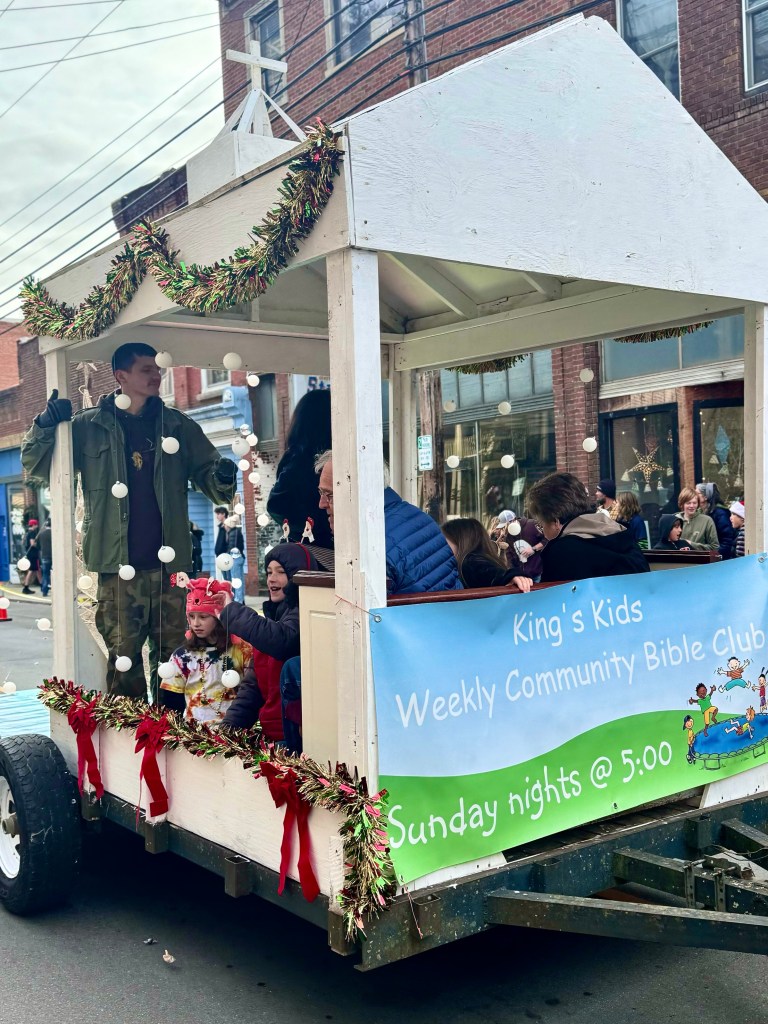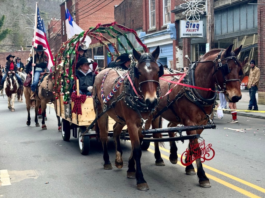 There was a car full of people with a large dog representing Shady Side Florists, where half of the flowers sold are plastic. The animal shelter in red white and blue paraded a number of confused dogs on leashes who needed a new home. The King’s Kids, Community Bible Club had a display with kids sitting inside. Plum Pro, Your plumbing and water specialist, had a truck. At the end of the parade was a long line of horses with the riders in red, white and blue carrying American flags. Christmas was celebrated by the Christmas decorations on most of the floats or cars and by loud Christmas carols blaring from the courthouse steps. But mainly the parade was a celebration, I think, of local businesses and institutions as well as a large dose of patriotism. Candy was tossed from every vehicle and children raced around picking it up. I think everyone who lined the streets waving at people they knew in the parade had a grand good time.