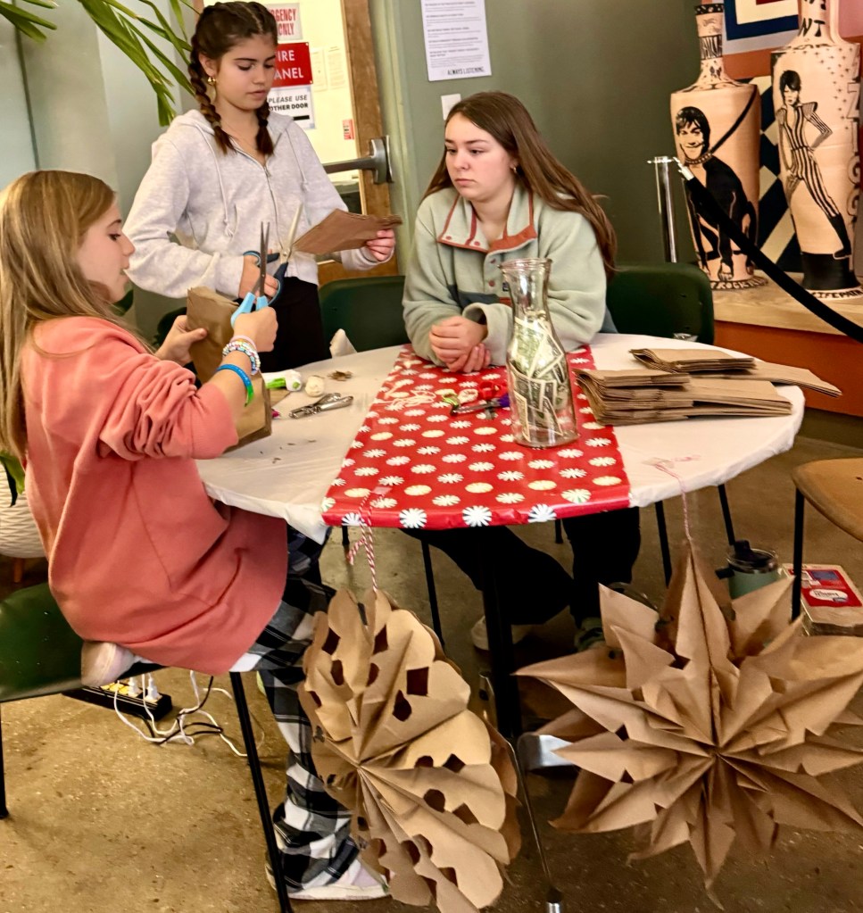 But coming back from Greece, and without Kathe here, Christmas has almost passed me by. True, I saw the Christmas rush in Athens and the decorations in Syntagma Square. This Saturday after driving back from Marshall I parked in town, intending to go visit the Art Museum, but almost immediately I ran into Jude Stuecker, an old friend, and her daughter, and walked with them to the Grove Arcade, where the two daughters, Sylvia and Lucy, sat at a table and made Christmas ornaments and Jude and I looked at the Christmas decorations in the Grove Arcade, an indoor 1920‘s shopping arcade. So now I know it is Christmas. I even spent the day today helping Susie make a Christmas present, the presentation of a gift from Kathe to her granddaughter. And finally I am being warmed by the Christmas spirit.
