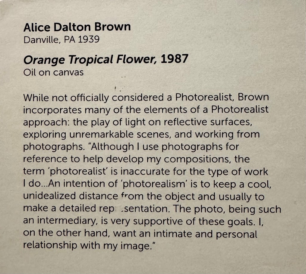 My brother Ted died in 2013. Half way through the exhibit I saw a familiar name, Alice Dalton Brown born 1939, my brother’s birth year. The Dalton parents were friends of my parents and I’m sure that Alice Dalton was my brother’s girlfriend for much of his college time at Cornell University, which was in Ithaca where both parents and Alice lived. I know that she became a painter who sold her paintings for thousands of dollars. Hers was the one painting that the painter claimed was not based on the principles of detached photorealism but was painted because she felt the subject touched her emotionally.
