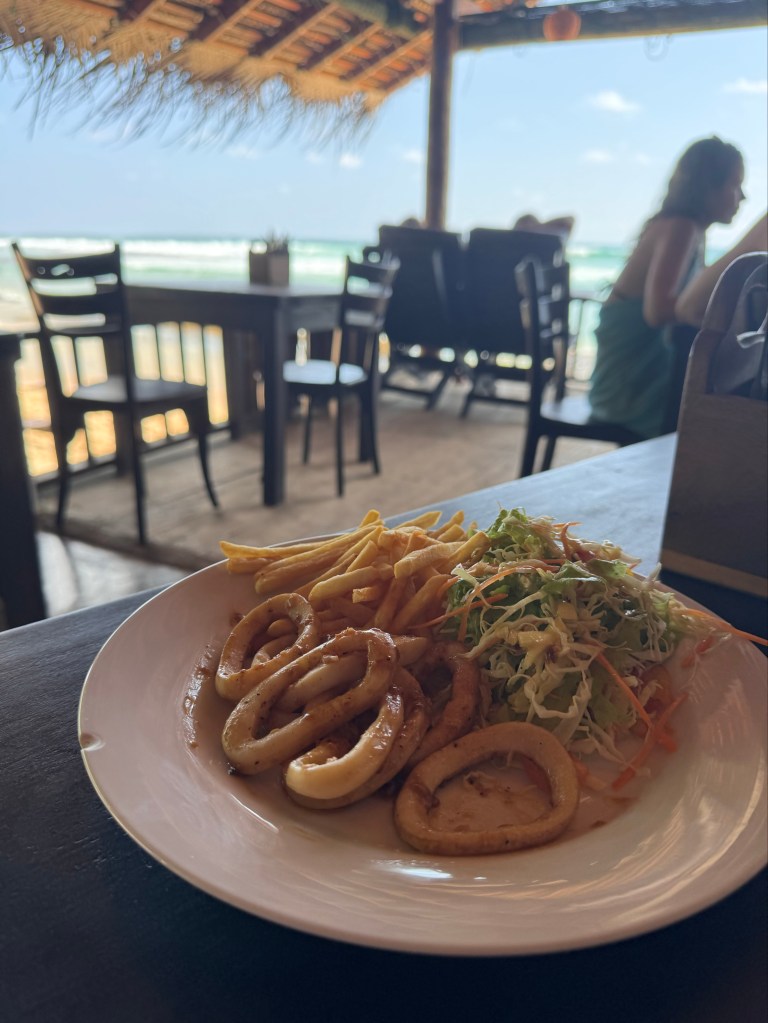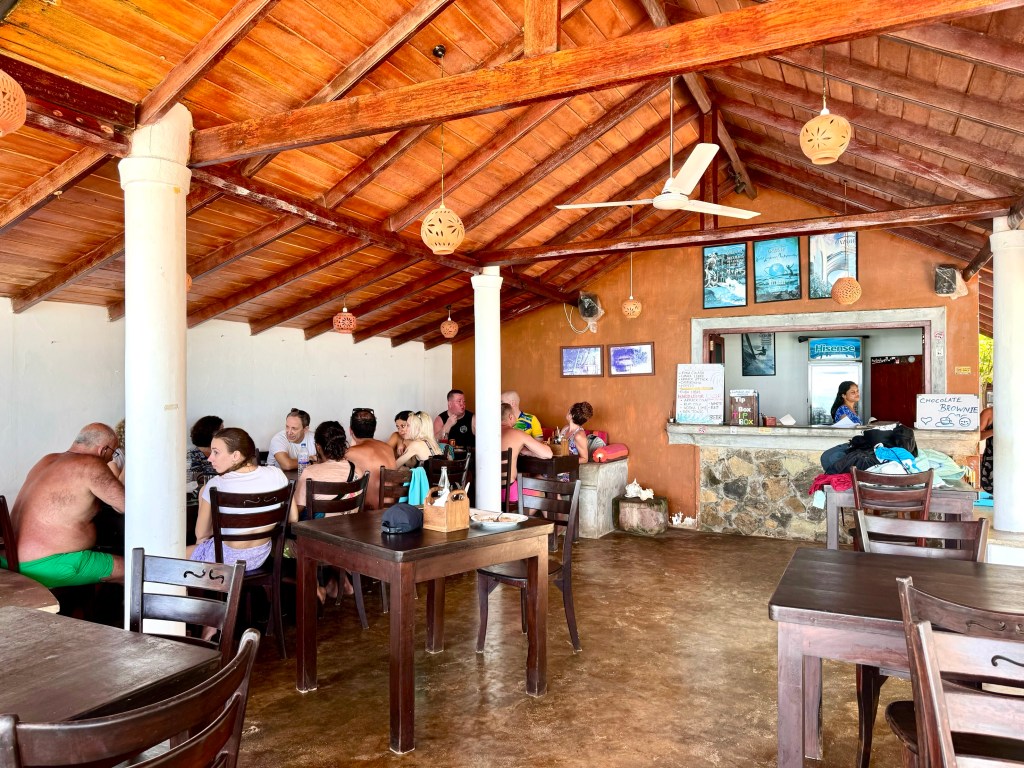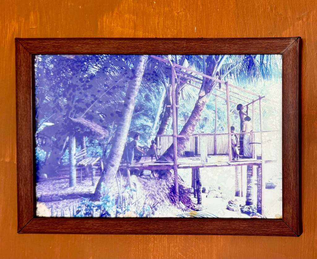 Rathna‘s business is great. Her two sons, who were in their early teens in 1995 when their father died, are now in their late 40‘s. The father was sick on my first visit with Tom and his grave was in the front yard on my next visit. Family members are running the place. The room where Tom and I stayed next to a leaning palm tree had been rebuilt and is now a double decker. A beach room like ours, that had been about $10 a night, is now $50. I ate a grilled calamari lunch at their crowded restaurant and took photographs of the place and the family. The food wasn‘t as good as at Nooit Gedacht for the same price and the rooms more expensive. But Rathna‘s Guest House is crowded and thriving. I left feeling both sad and happy.