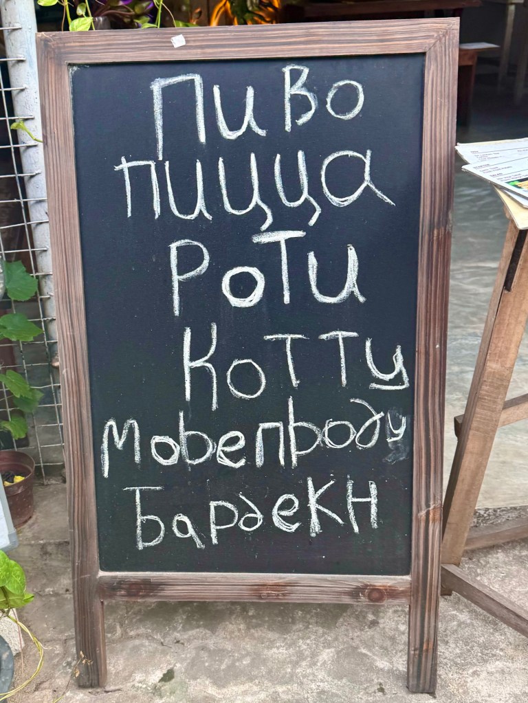 But one of the biggest changes that is slowly dawning on me is that the people who are sitting at the tables here and who are strolling through the streets are not Germans or Italians or Scandinavians, they are mostly Russian I was aware that I couldn’t identify the language that people sitting in restaurants near me were speaking. They weren’t speaking German, Spanish or French, they were speaking Russian. English is a basic Sri Lankan language since the British days and many Sri Lankans speak English and the store and restaurant signs are in English and Sinhala. But a great number of the signs now along the street in Una Watuna are also in Russian.
