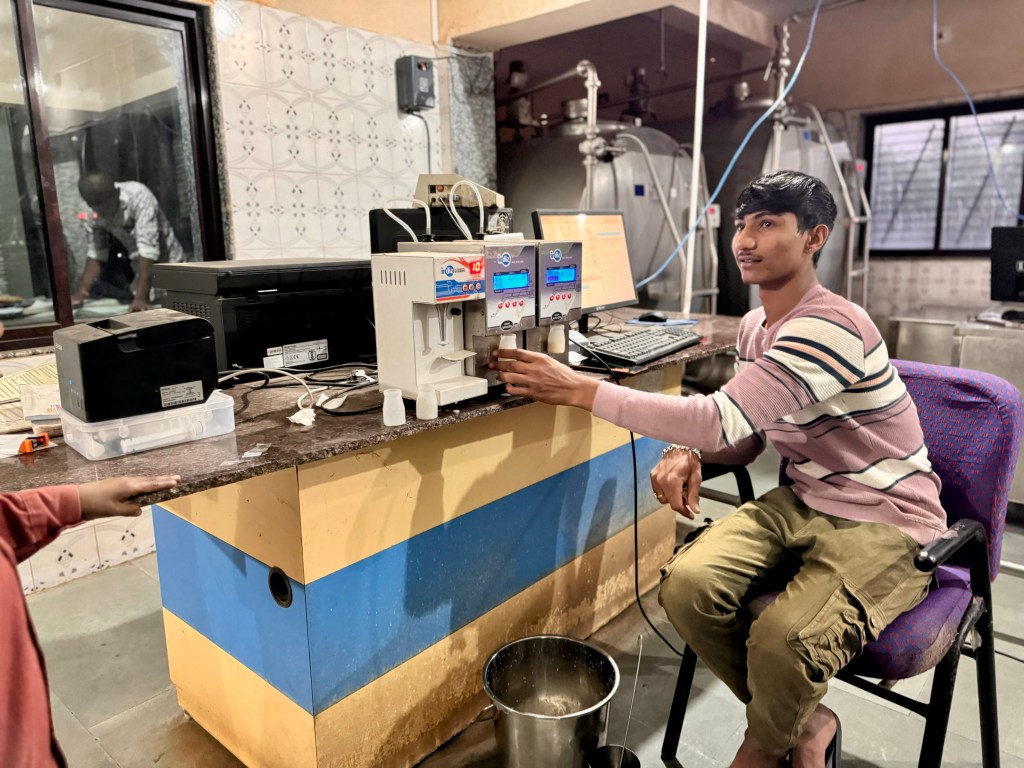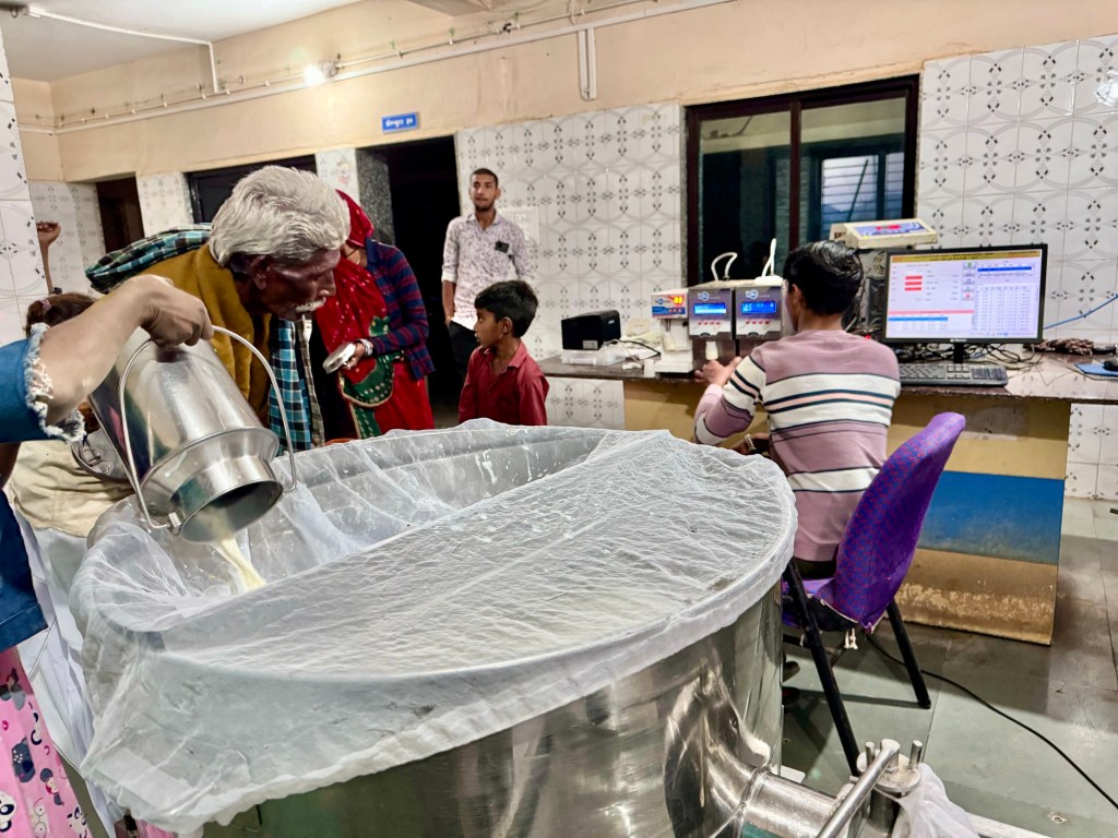 And then after visiting a dairy where the milk is first measured for fat content and then weighed with a receipt for the value of the milk issued to the people bringing the milk in metal canisters, we came back to the Ashram just in time for evening prayers.
