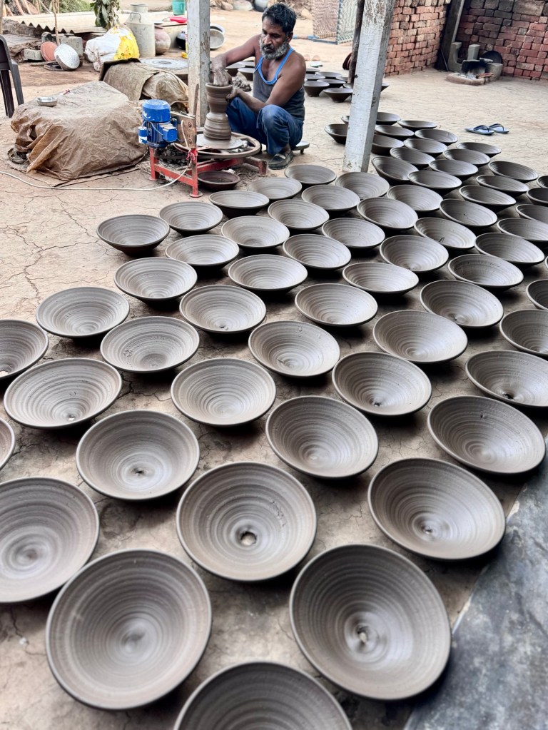 After I wrote that, in the late afternoon, I was taken by Jogesh to another nearby village where we first visited a potter’s home where they make clay pots for sale in the biggest nearby market town, Porbandar. Nothing has changed in the last 50 years for them except that use and electric potter’s wheel rather than one spun by hand.