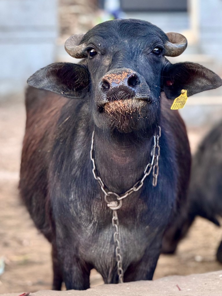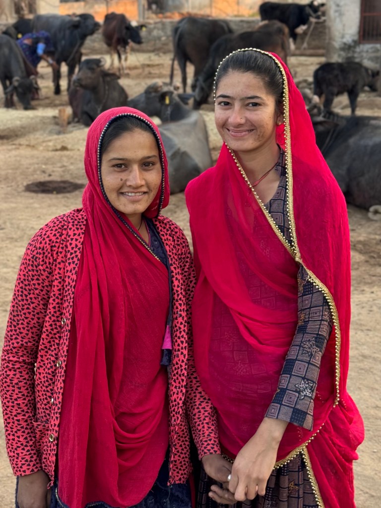 And then we went on to visit two Rabari, herder’s, family homes where the courtyards were filled with water buffalos and cattle. The second family were three brothers living in houses side by side, a joint family, with the male children intending to live there as well. It is very much a male dominated patriarchal society, with the girls married away in arranged marriages, some even arranged shortly after the birth of a girl. All the women seemed content and smiling, often with their faces partially, or all the way, covered from male outsiders, but their lives are so different from that of American daughters.