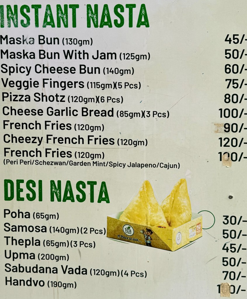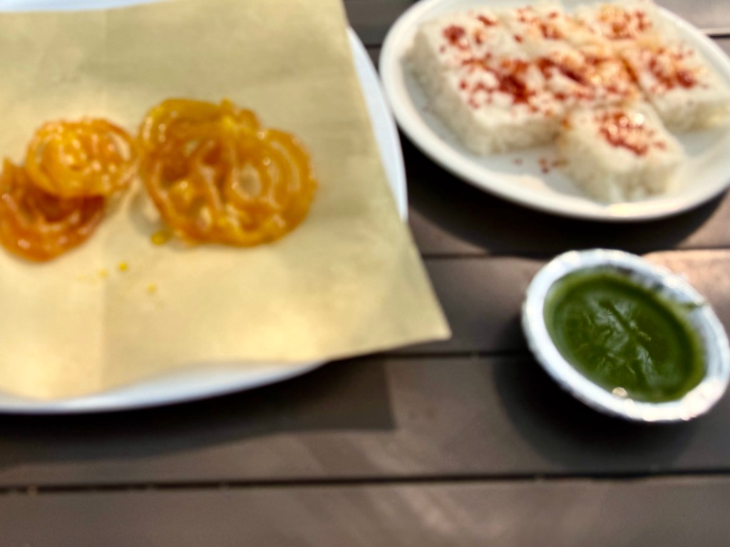 The outdoor stand where Shilpa ordered our late breakfast had nothing that I recognized from my time in north India, except for orange super sweet jalebies. Instant Nasta, instant breakfast sounds Western, Desi Nasta is Gujarati breakfast.