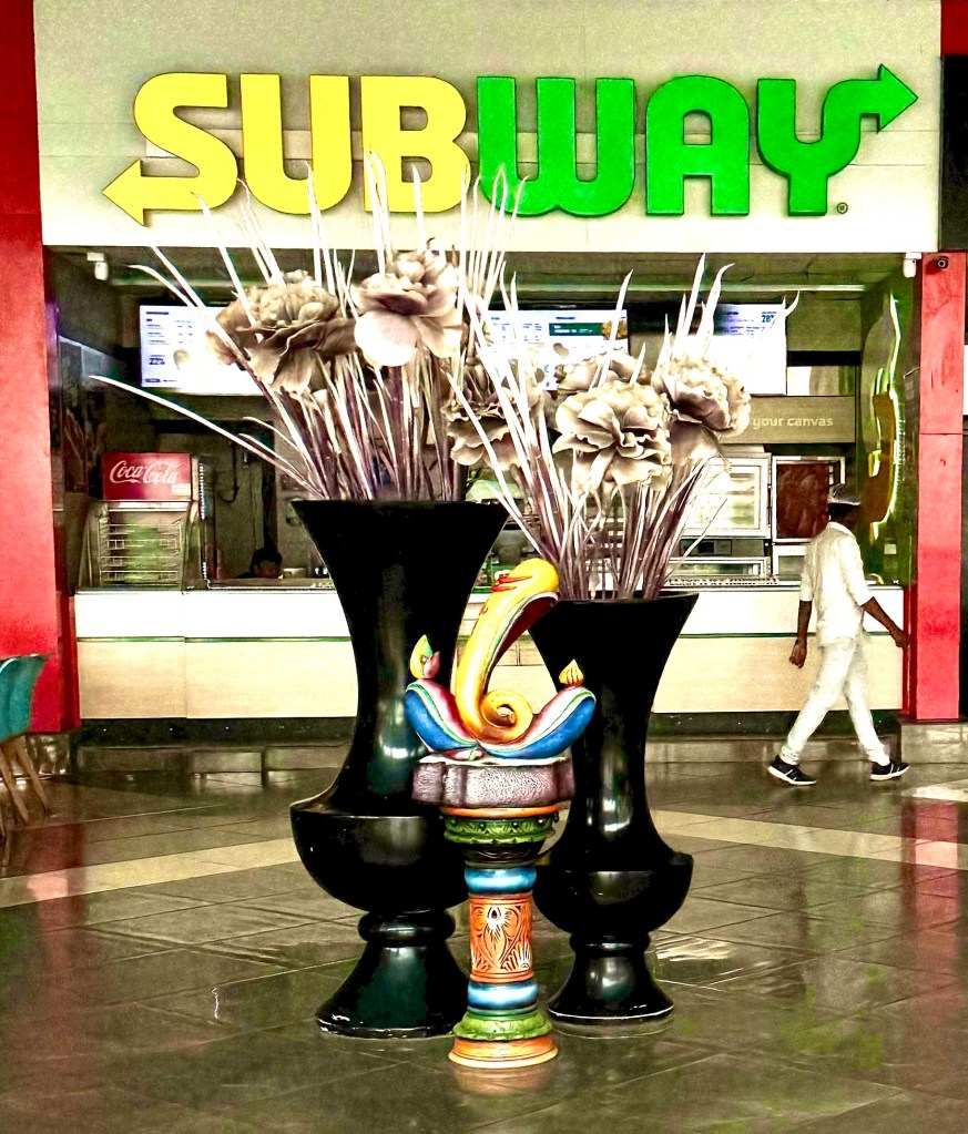 We stopped once, at the Bliss Food Court, where we ate outdoors in the shade of a tree. The indoor food court featured a number of restaurant stalls, one of which was Subway. I didn’t think to go up and photograph its menu but I can guarantee that it offered nothing that is offered in the Swannanoa Subway, certainly no choices of meats.