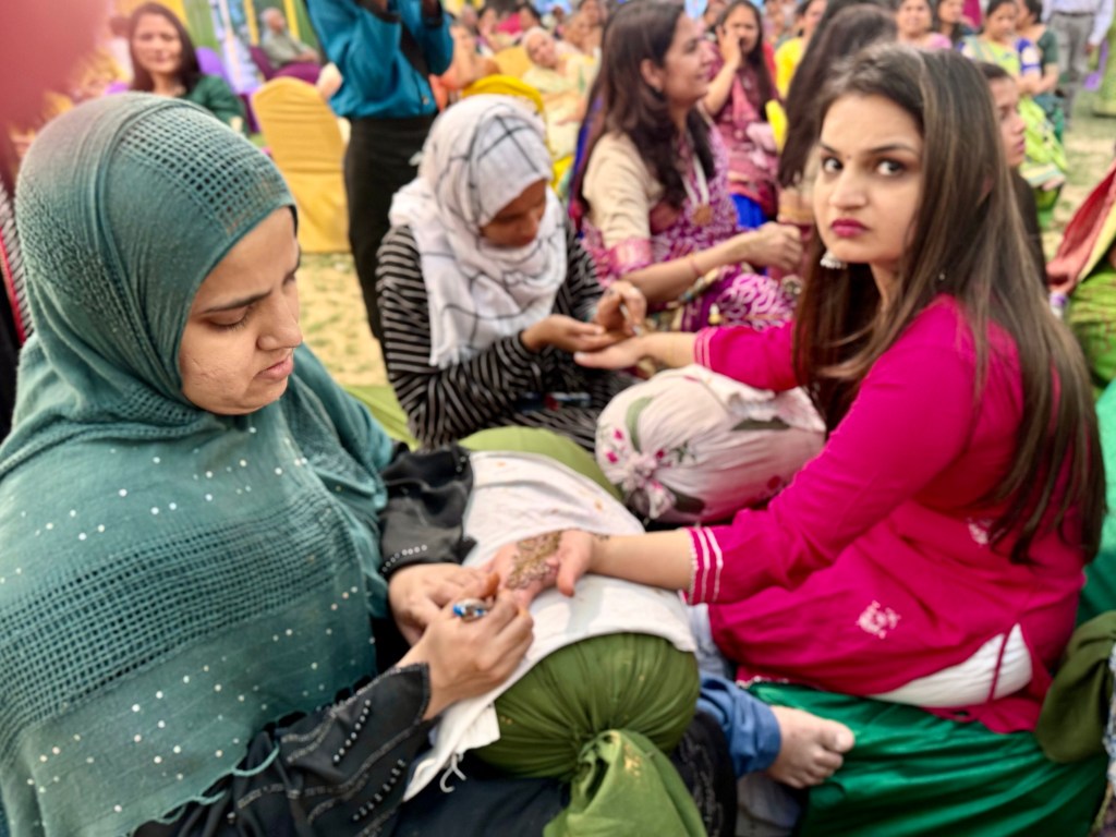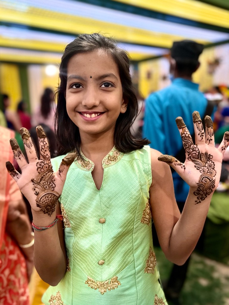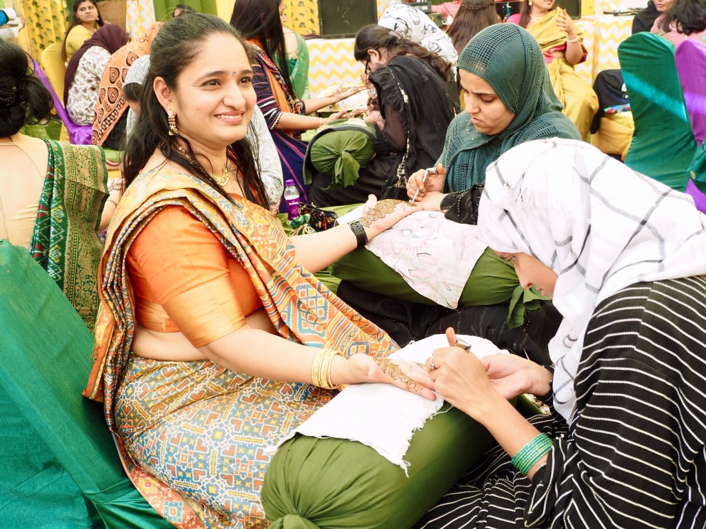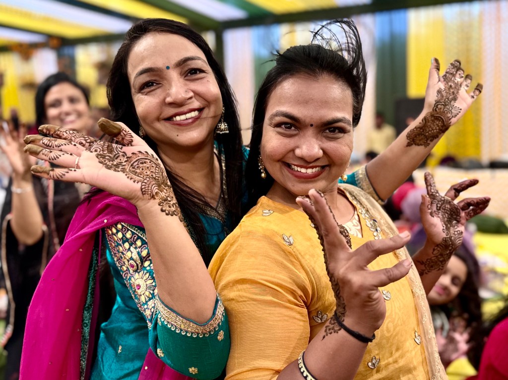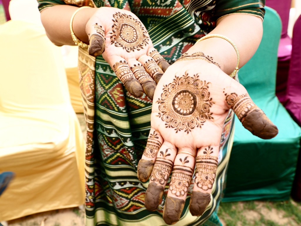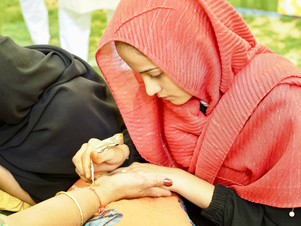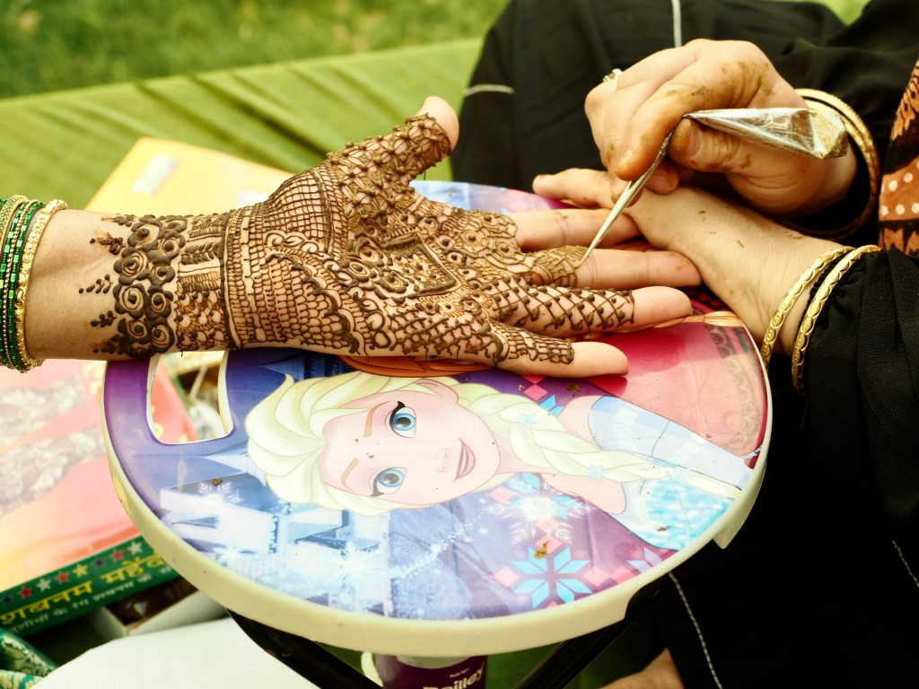 in the colorfilled field outside teams of young women adept in hand painting with henna applied henna to the hands of any women attending the wedding who wanted to have their hands painted. Then the women would stand in front of a huge fan to dry the henna on their hands and then wash off the henna paste, leaving an elaborate design. The quality of the designs depends upon being able to apply the henna in very thin lines in order to make elaborate designs. In a week or two the red design will slowly fade and then disappear.
