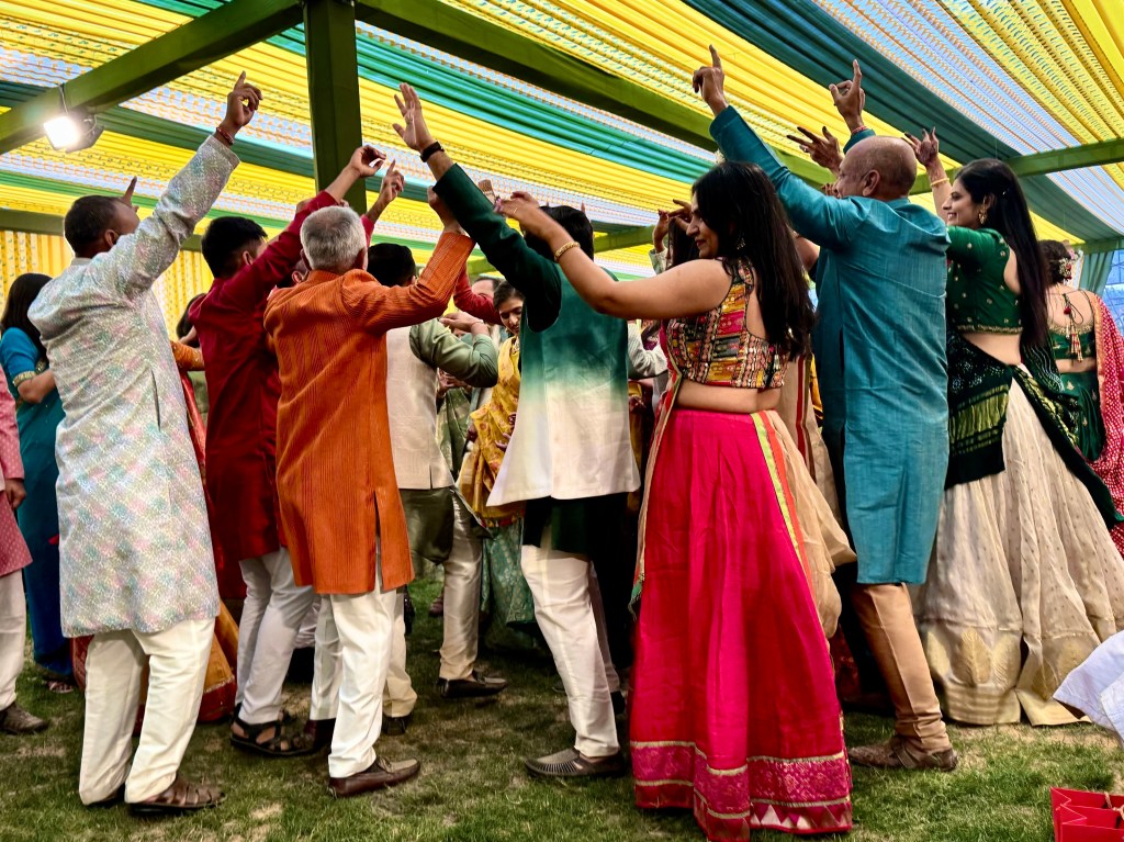 The late Saturday afternoon wedding event for 900 guests was held at the Hanuman temple built by Jitubhai the father of the bride on the outskirts of Ahmedabad. Hanuman is the monkey king who supported Rama (an incarnation of Vishnu) in his defeat of the demon Ravana who had stolen Sita, Rama’s wife. Beside the temple is a large field, colorfully enclosed with bright colored cloth walls, was an area where women got their hands painted with henna with elaborate designs called Mahendi.