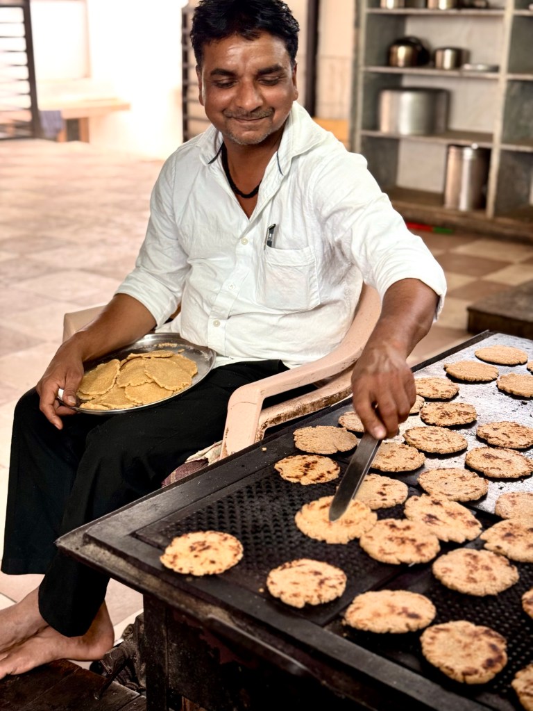 When I visit the Sarvodaya Ashram I try to be as little of a burden as I can. Aside from being picked up at Palanpur, an hour away, at 6 in the morning by Meet I have fit into the rhythms of the Ashram. When someone goes to a village I go along but there is no program for me on my own. Tea is provided to everyone at 7 in the morning, sweet milky tea with a thin round kakra and a thick round bakra, two kinds of bread. Then at 8:30 or 9:30 we all have breakfast together prepared by Praveen, the cook, who also cooks with help for the 150 students. Then lunch is at 1:30 or 2:30, another round of tea with kakra at 5 and finally dinner at 8:30. If nothing else is happening and Hasmukh and Shilpa are busy, I spend most of the day in my room. But when visitors come to the Ashram and a program is arranged for them I tag along and photograph whatever is happening.