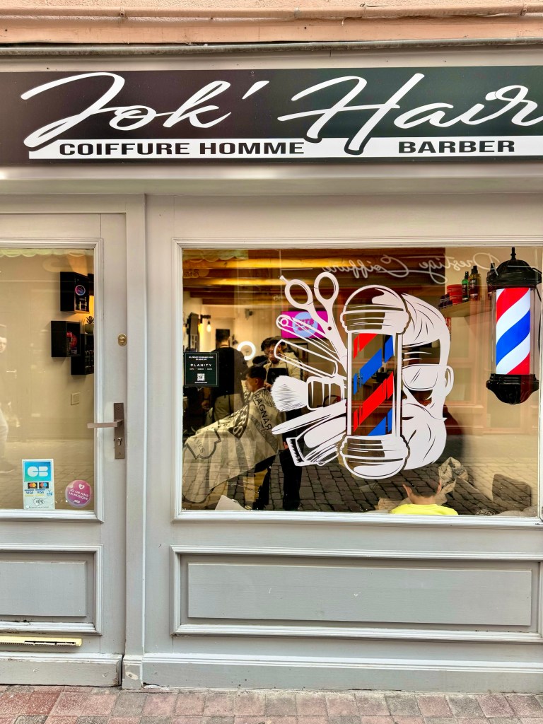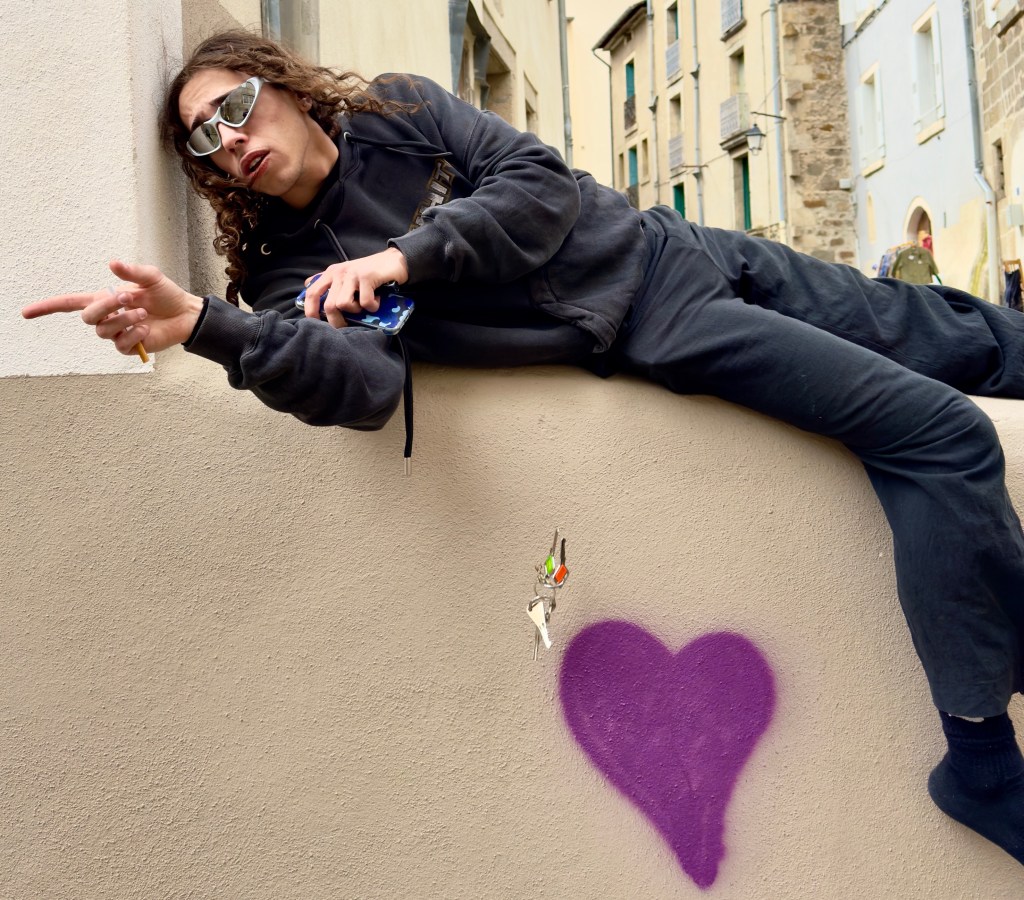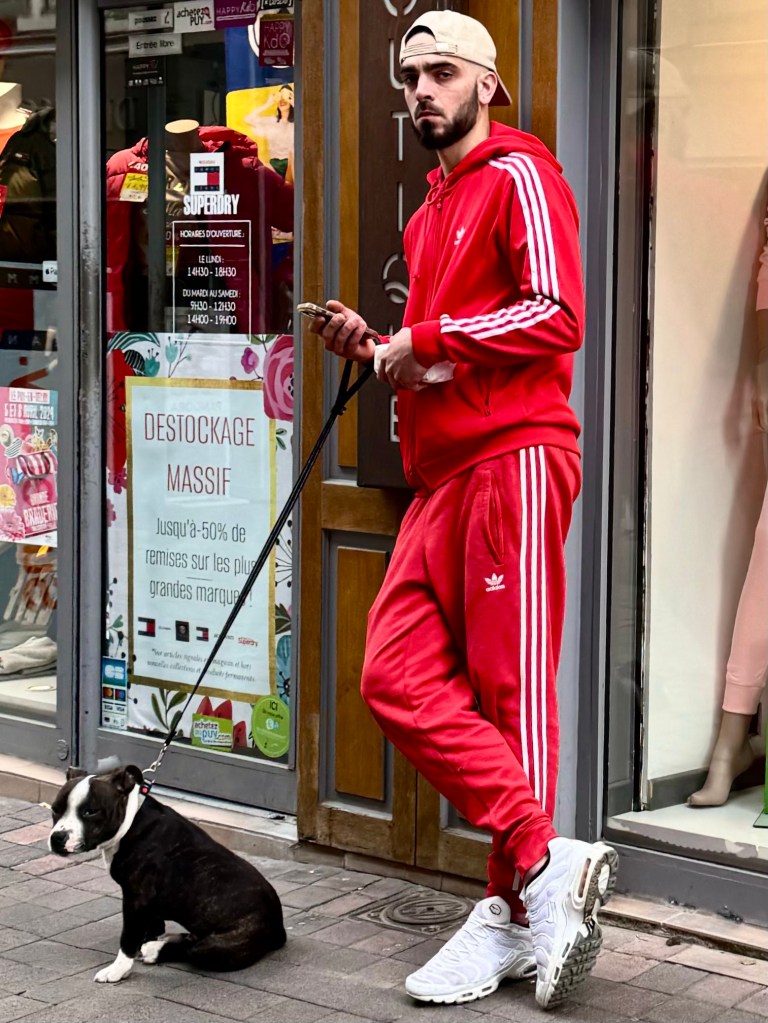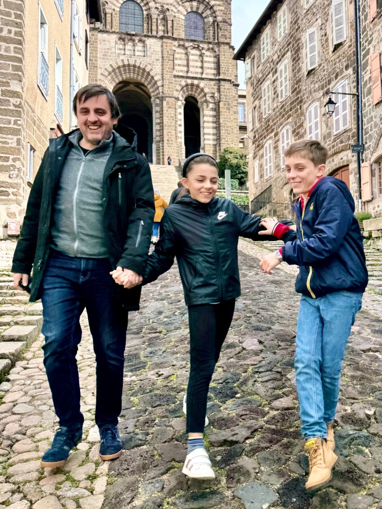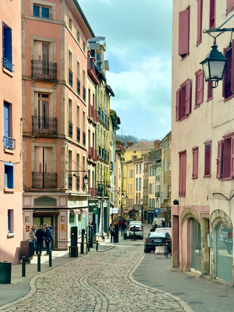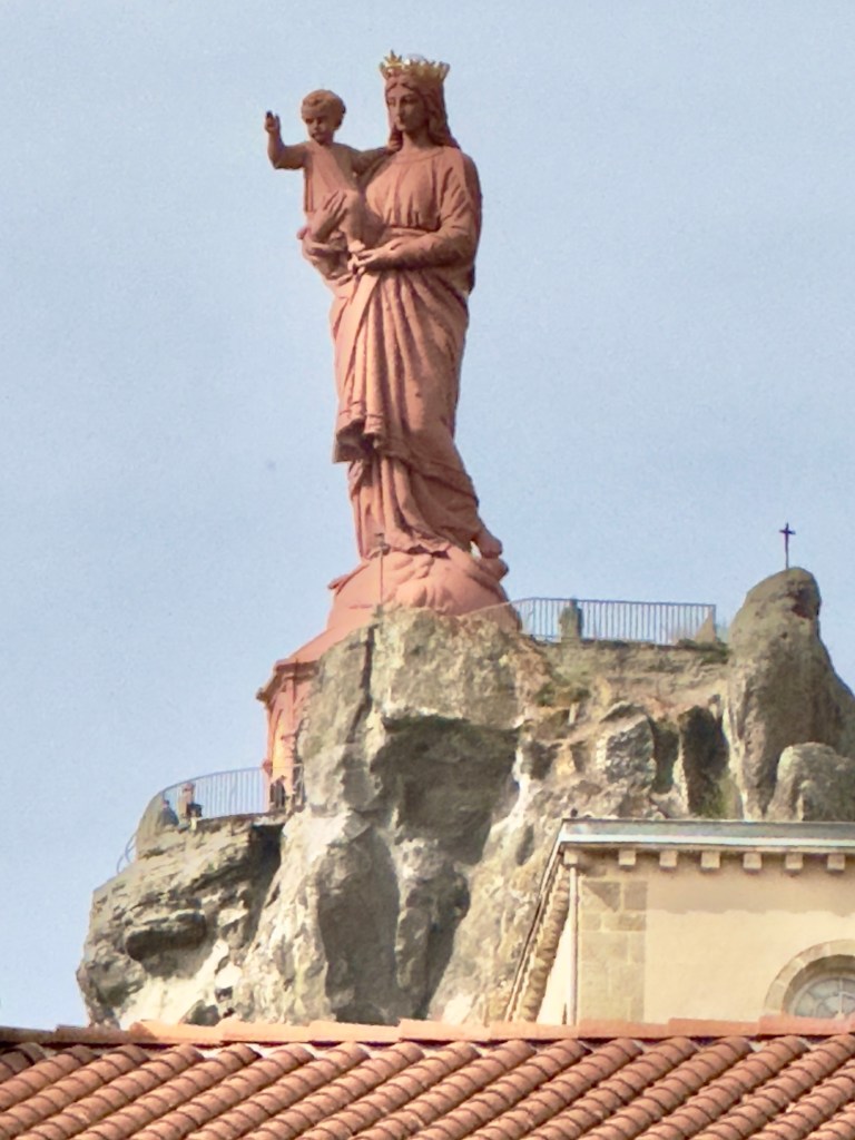 But when we got to the large town of La Puy-en-Velay the rain had stopped. We circled back and forth through the town center, a tour of the town, as we searched for a parking place. We found one and then settled into a very cozy restaurant filled with people and all three had the lentils which are the speciality of the region along with homemade sausage. And then we walked through the town.