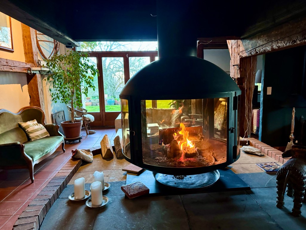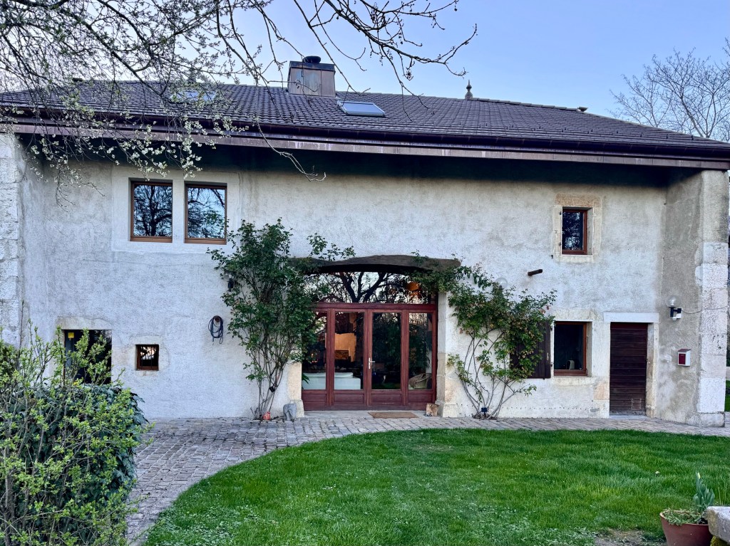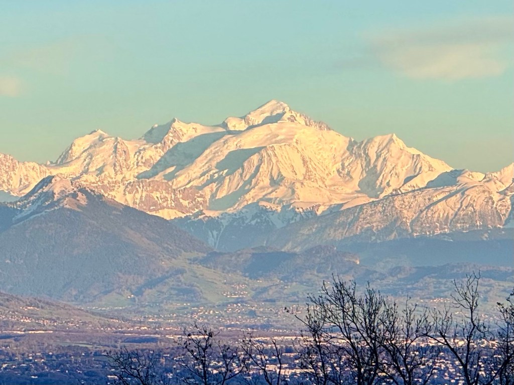 Then I worked on photographs for part of the day and then in the late afternoon was invited to go along with Craig to have a drink with some neighbors who live a short walk away. They bought a house about five years ago that at one time was a traditional farm house/barn with the house on one end and the barn with the farm animals and farm equipment on the other. They now have an apartment in the farm house side and a beautiful big living room dining room with a circular fireplace in the center on the ground floor of the old barn with the heavy exposed wooden posts holding up the second floor exposed. Up a staircase were bedrooms. On one side of the house was a wide meadows lawn with flowers and a view of Mont Blanc, on the other side was a view of a ridge of the Jura mountains and on the third side a large table where the couple who owned it could have parties. It was all fairy tale enchanting