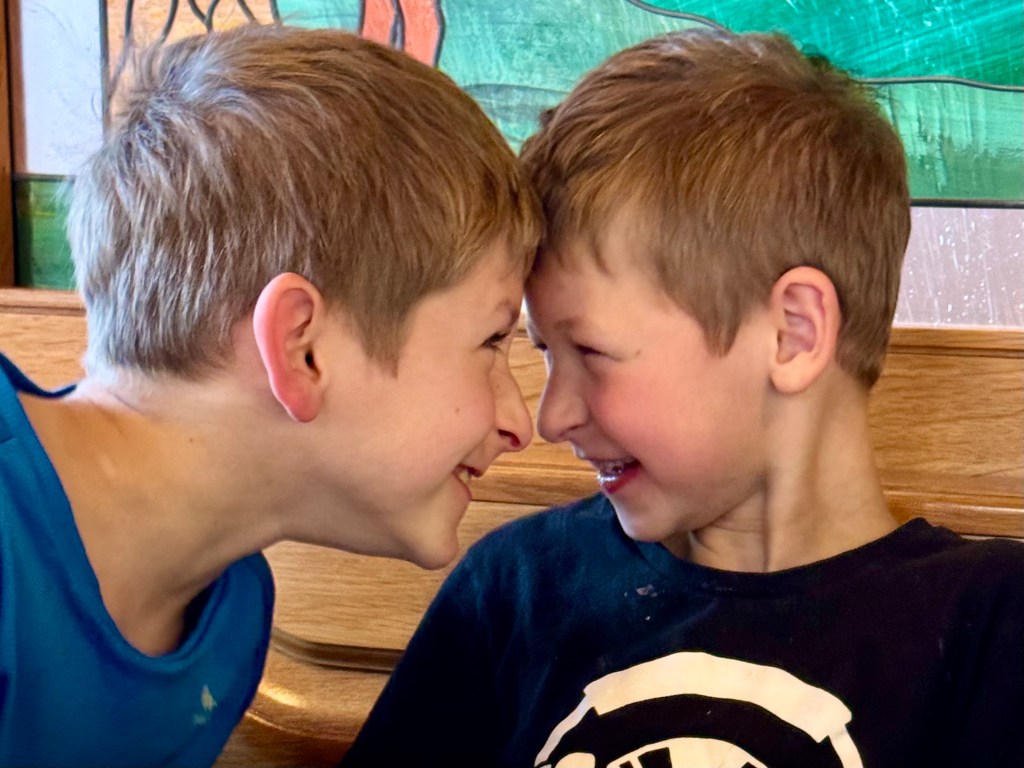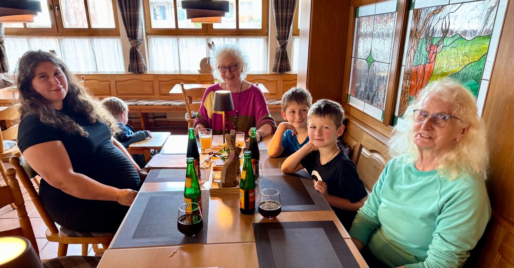 We were going to go to Mespelbrunn, a nearby castle, for an outing, but before we could go Nina, Dorothee’s daughter appeared for the day with her four sons, aged 12 to 2, while very much pregnant with her fifth child, a girl, Anna. So we spent the day in the house with the children running around and two huge dogs howling at times with jealousy when the other got more attention.