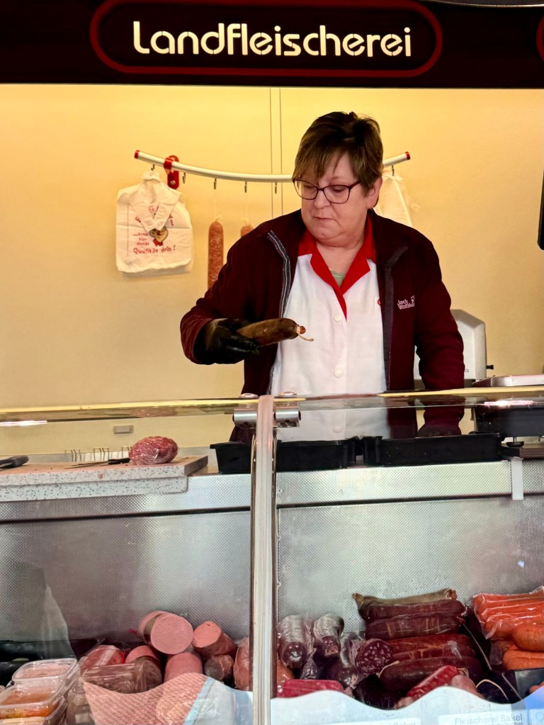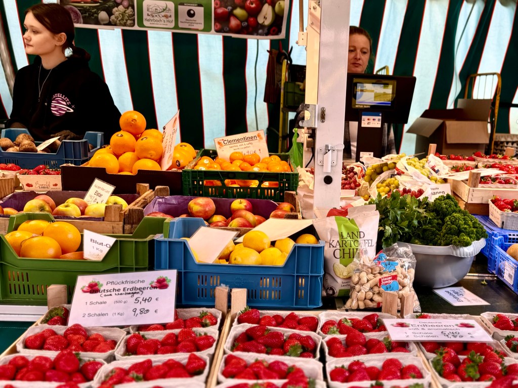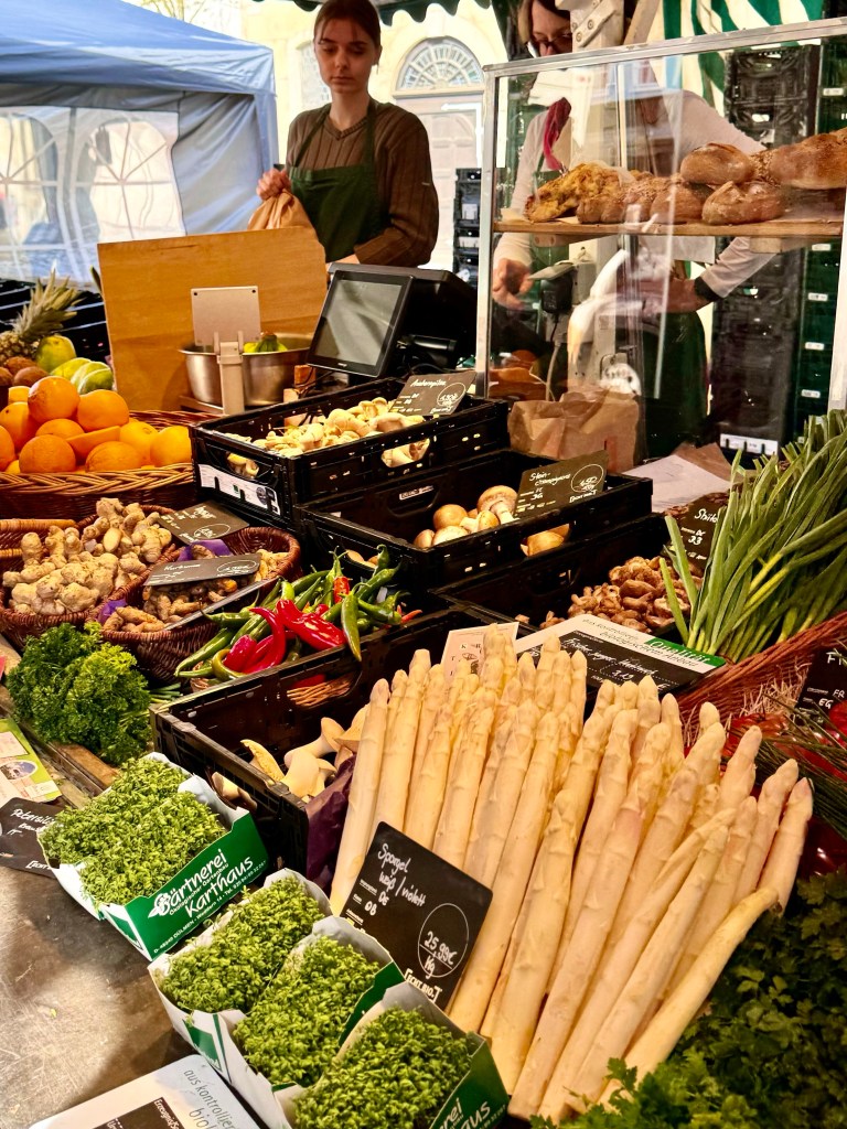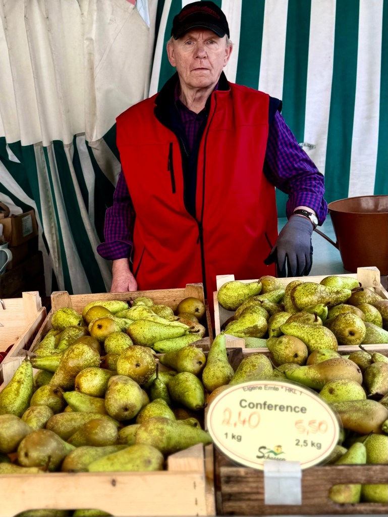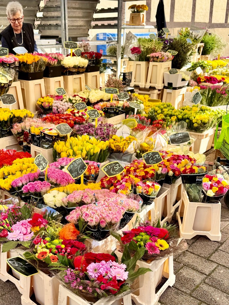Every Saturday the wide square near the castle and beside the large church fill with farmers and flower growers selling their wares in an outdoor market. I walked through it three times, first photographing individual sellers, then a second time, spatial videoing the whole market and then a third time photographing people.