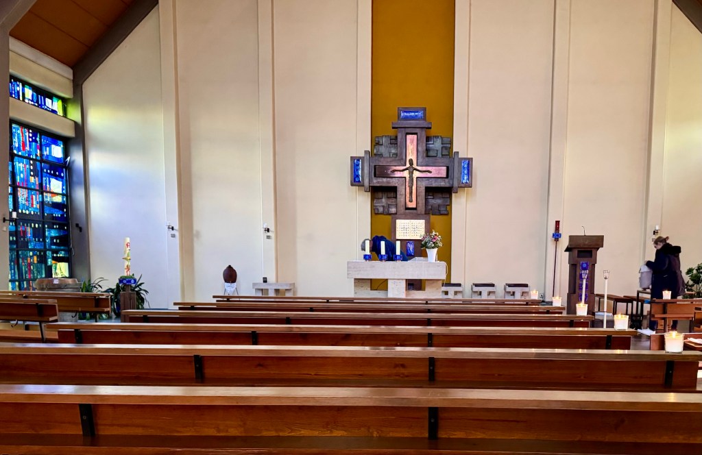 I raced back (in my case this means walking slightly faster with the feeling I was racing) to my apartment and then was off to meet Elke to go to a Catholic service in a beautiful Catholic Church which is about to be abandoned by the church because there is no priest to staff it. There were about 15 people there who are trying to keep the church alive. Women of the church had chosen readings and we sang hymns. Nothing was familiar and it occurred to me that this was probably the first time I had attended a Catholic Church service. Again I was clueless. Following the short service we sat down to a meal of homemade bread and cheese and places of raw vegetables.