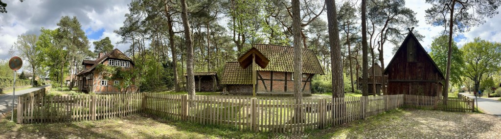 It rained in the morning but after lunch (half of the remaining leftovers after the huge meal last night) the sun came out and I ventured out to make panorama photographs of Winsen which I’ve found look terrific on the Vision Pro. I walked through Winsen making panorama shots of typical Winsen streets to the Museumhof, the restored 17th century village at the edge of Winsen. By the time I got there the sky was overcast and by the time I had made panorama photos and was making a video of the buildings it had started to lightly rain.