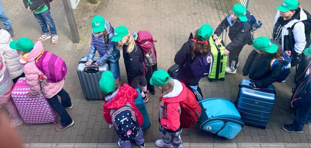 We got off at Jubek and found ourselves in a crowd of about 100 school kids in green hats, about 12 years old, who were jostling each other and baiting each other in shrill voices. They are on a school outing, each with a rolling carry on bag which they rode on as they played bumper cars with each other even as their women chaperones tried to keep them from getting to close to the track. When an express train hurtled by almost knocking them flat with its wind they calmed for a moment and then burst into action again. It occurred to me that this is what the school trips that Kathe had told me about with such fondness must of looked like, chaos, with Elke and Kathe, best friends, joining in. I was visiting Sylt to see what had so attracted her and was finding out.