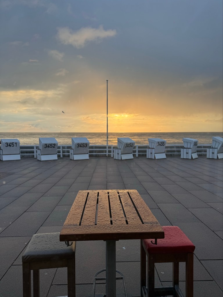 I ate a lunch of black shelled mussels in a restaurant by the water and then took the bus back to Westerland. In the evening I went to the Gosch seafood restaurant where I watched the sun setting through the clouds over the ocean. It was a good day.