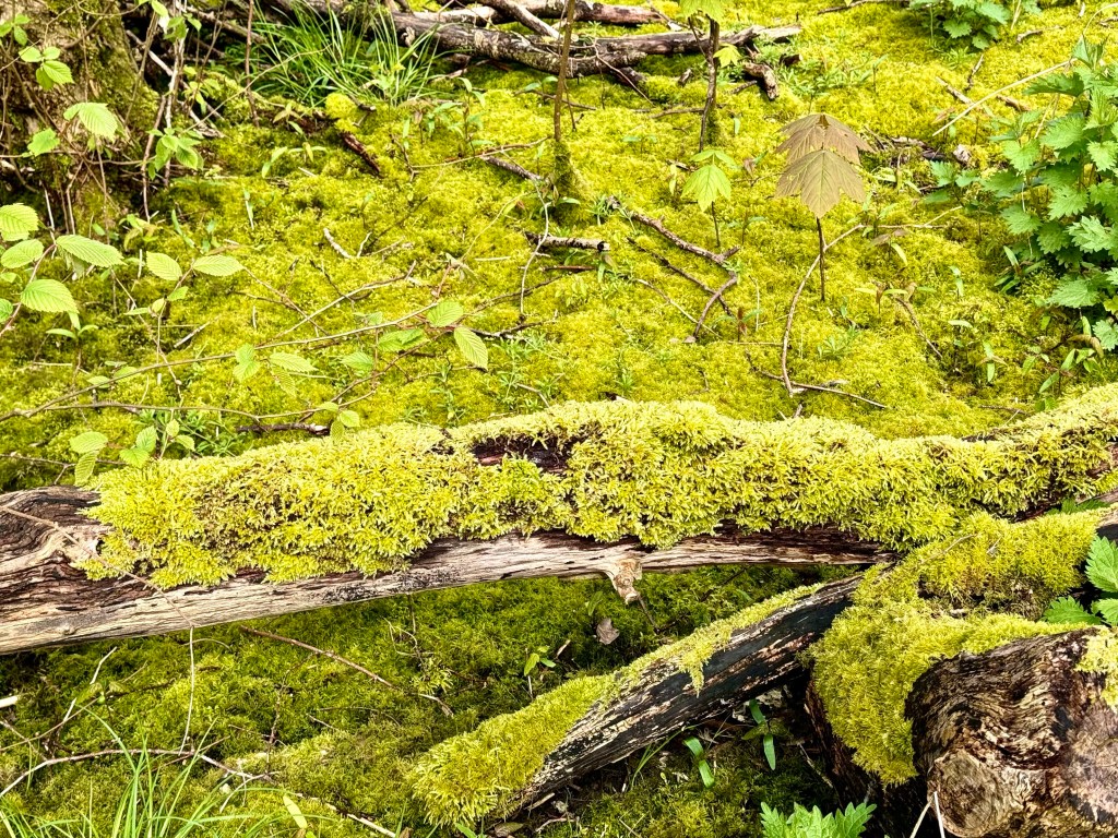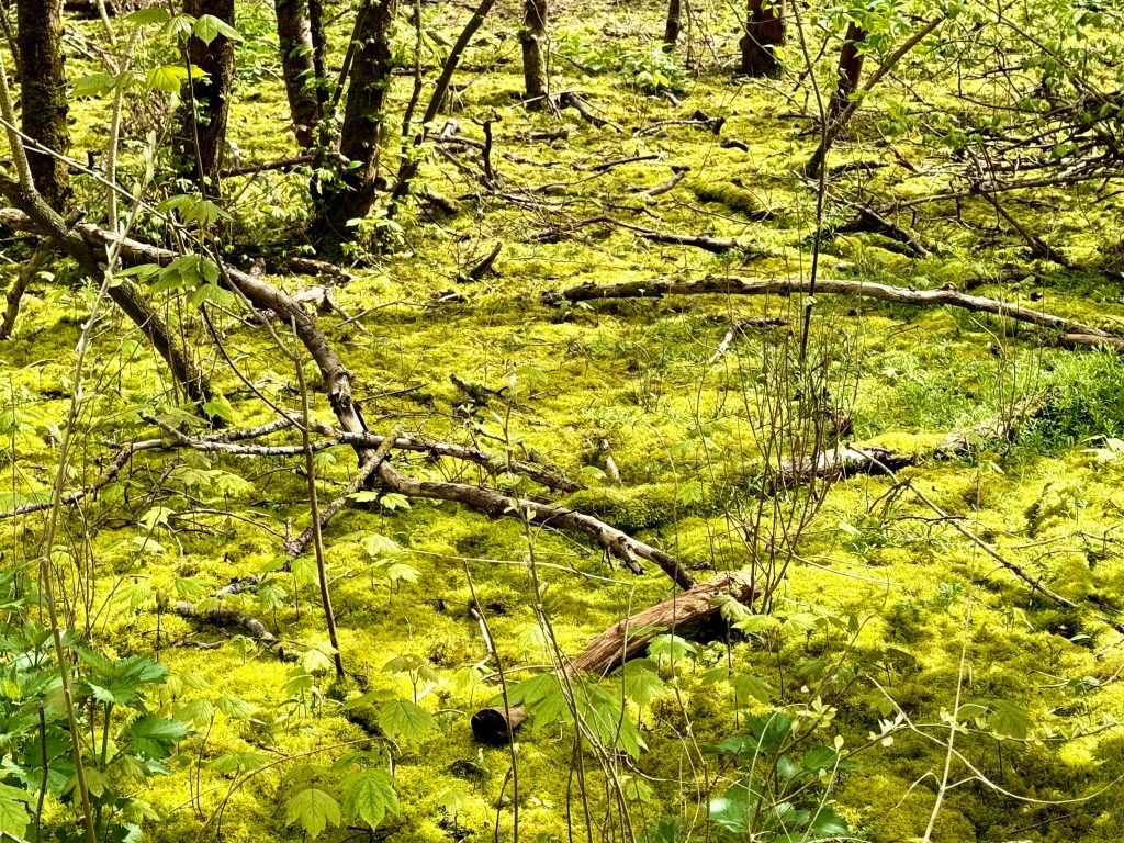 But just off the beach is a protected wooded area with paths through it. The sun came out for the first time as I entered this mossy woods. It is a fairytale space with the yellow green or purple green leaves just beginning to form. I am sure that this is one of the places that school children visit, although the only place where I saw school children was on the wide beach, chasing each other and playing in the sand.