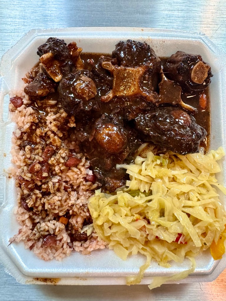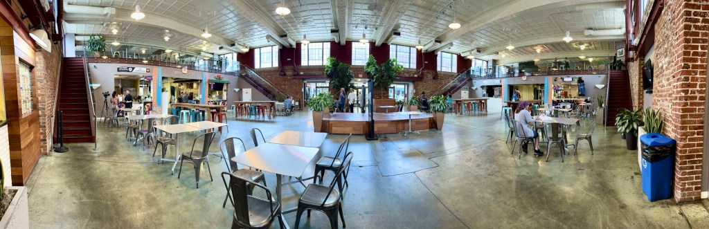 We stopped in Roanoke for lunch at the City Market which is at the Center on the Square. There is a farmer‘s market outside the City Market, inside is a food court with a variety of esoteric restaurants. I have a plate of Jamaican oxtails, great big bony chunks with little meat, with boiled buttered cabbage and rice and gravy.