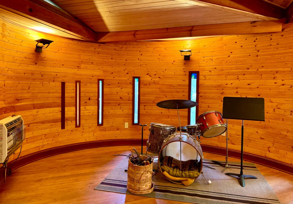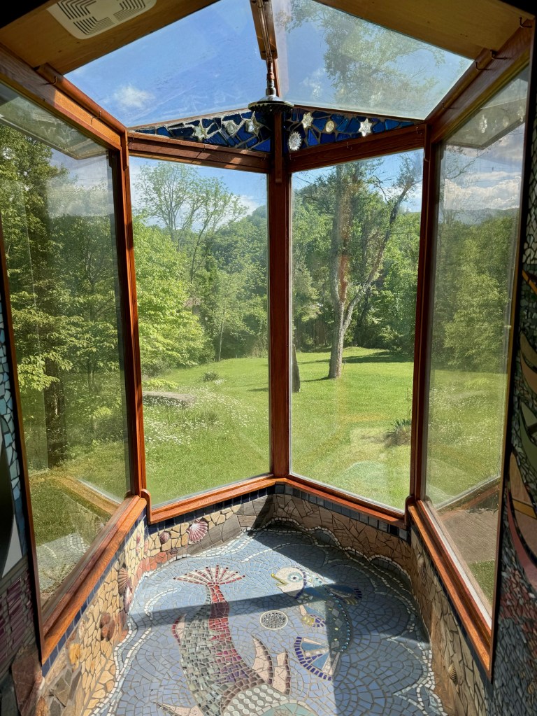 The main building is a hodgepodge set of added on rooms with different shapes and fabulous stained glass windows and very ornate, almost Victorian woodwork and tilework. Every room is a work of art dreamed up by Camille. She led us through her current project, the rooms in which she is going to live when it is completed. There is an elaborate glassed in circular stairway, leading past beautiful guest rooms with a shower room extending out into space from the second floor, entirely glassed in so that you can shower in naked splendor for all the world to see.