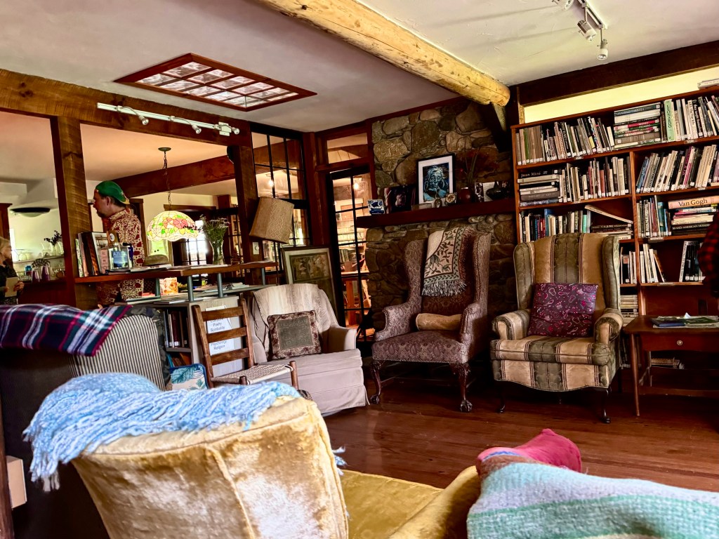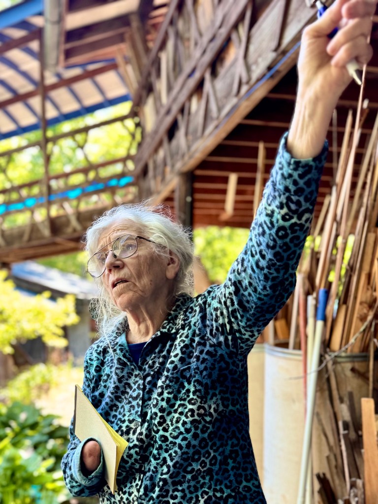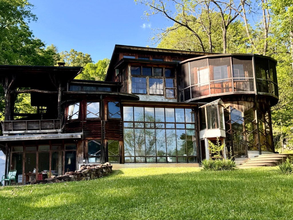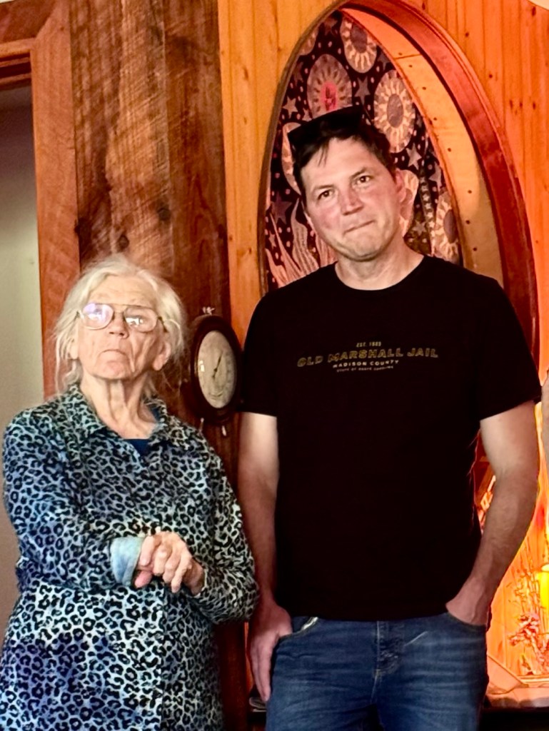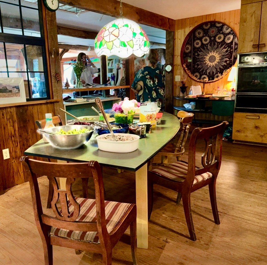 Azul is a an artist‘s haven in rural Madison County north of Asheville, built and guided by Camille, a French woman who married an American who worked in the Hot Springs post office in Madison County. Her husband contracted multiple scherosis and died a number of years ago. But Camille, who is an artist in many mediums was determined to build a retreat for writers and other creative people, inviting them to spend a month or more at Azul concentrating on their work. Camille, a petit 81 year old who lost an arm in France after the Second World War when she picked up an unexplored grenade as a child is an intense live wire. Such was her determination that she excavated the basement of the main building with her one good arm, one wheel barrow full a day. Her vision and her drive has attracted financial support for the retreat through fundraisers and auctions. Once a month she and volunteers host a potluck which was the reason we were there.