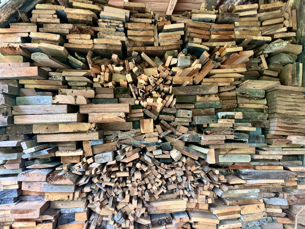 In a couple of storerooms and a barn she has collected all kinds of tiles and glass and different kinds of wood for future projects.