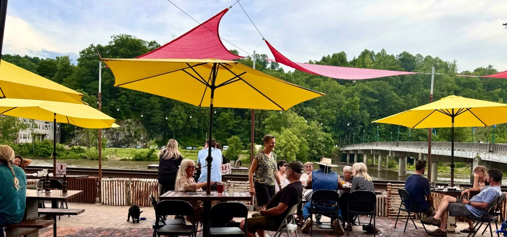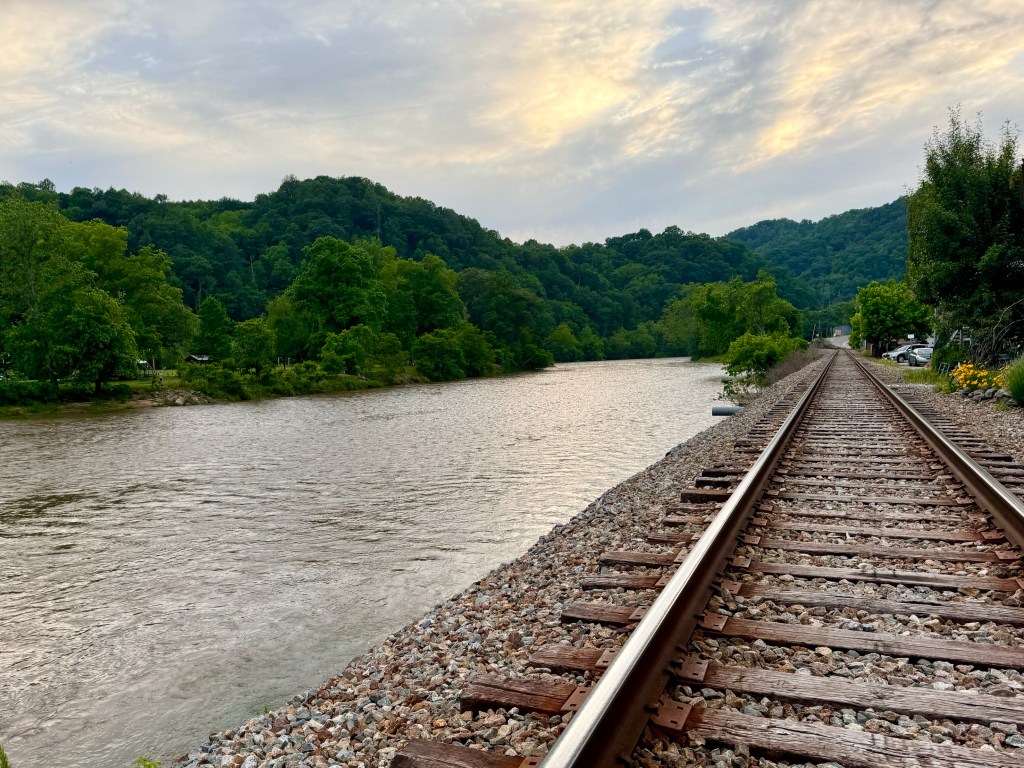 After looking at the paintings and talking to people Susie and I ate at the Marshall Jail restaurant in the old county jail, now a hotel, on the bank of the French Broad River. And then we walked along the railroad tracks which run on a narrow strip between the backs of the buildings on the Main Street and the French Broad River.