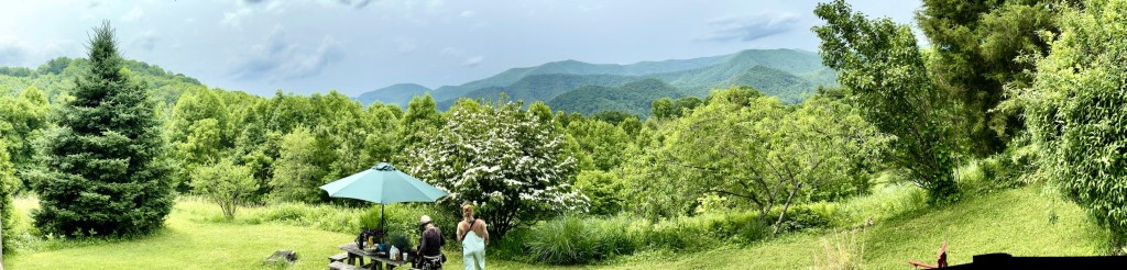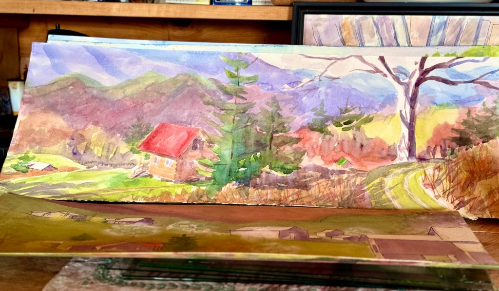 After almost an hour of singing as we sat on the porch overlooking the valley the sky darkened and the wind caused the trees to begin to thrash. We carried all the paintings into the log studio and drove home in the rain.