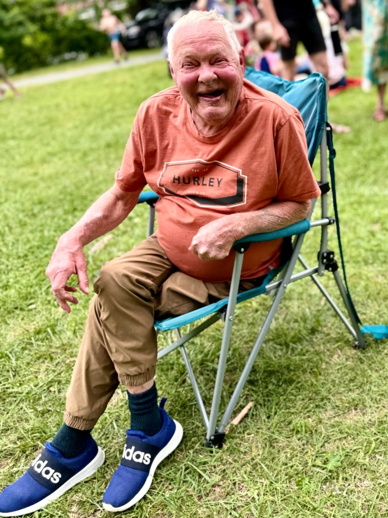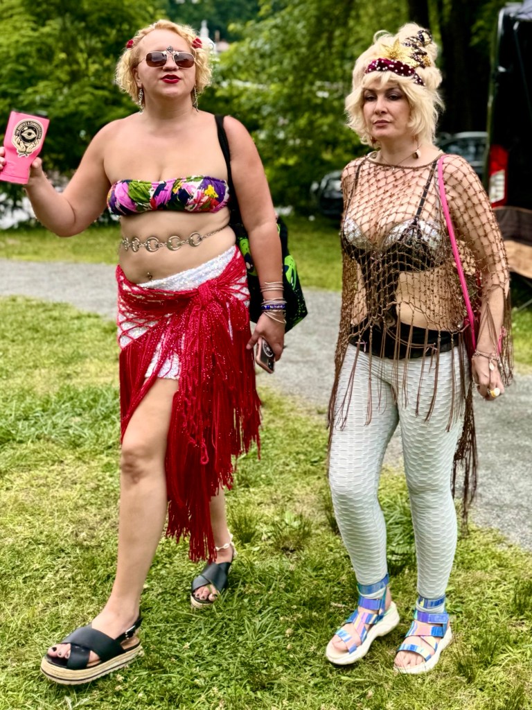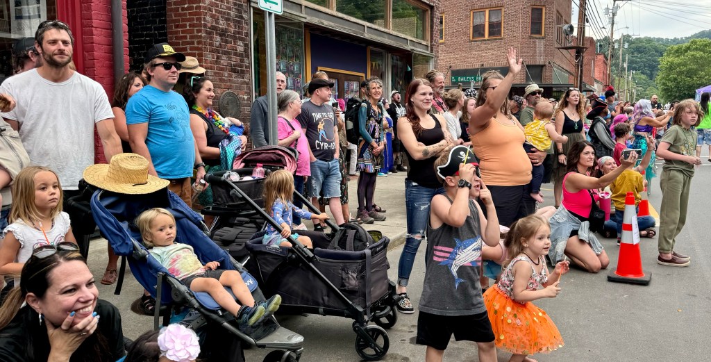 The day has grown into an all day celebration on Blannahassett Island across the French Broad River from Marshall. What was formerly the high school is now artists studios and around the building are wide lawns and parking areas. Beginning at 11 on Saturday, June 1, the wide laws were filled with artist’s booths, even an axe throwing booth, a number of food trucks with family sitting on the grass and children running around. The high point for the face painted little pirates and mermaids were a number of colorful inflated water slides and inflated castles where children could bounce on trampolines. I’ve included a couple of videos of the screeching mayhem.