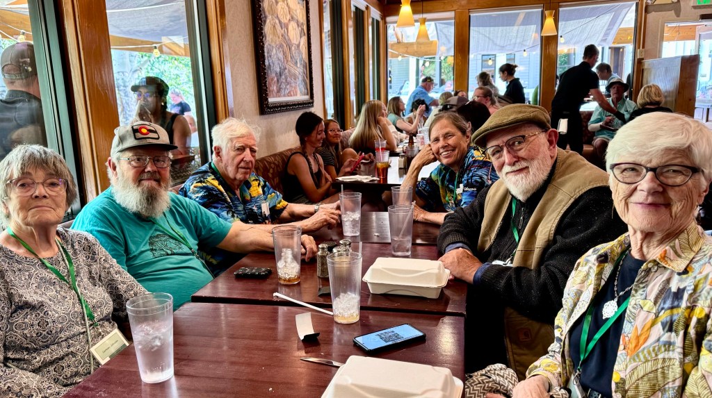 The four of us of the class of 1954–Marianna Presler McJimsey, Bruce Johnson with wife Carmen, Dick Parker with wife Maria, and Bill Mosher—met for breakfast at the YMCA Antic Cafe