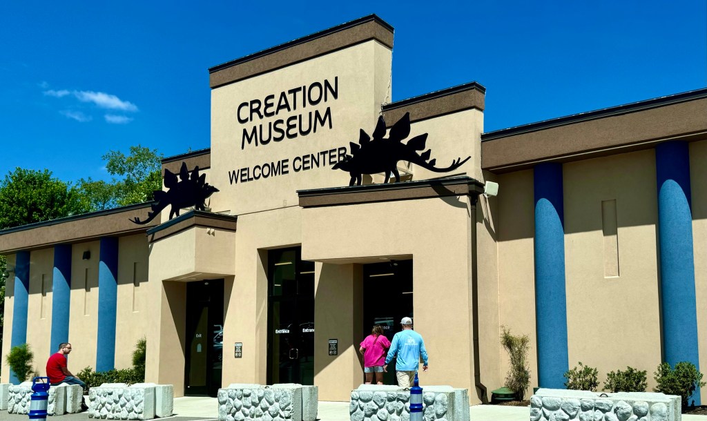This morning as we were driving from Rockville, Illinois on the last day of our trip as we crossed into Kentucky we saw a sign for the Creation Museum, a museum which attempts to combine the discoveries of evolution, for example dinosaurs, with the 7 day creation story told in the book of Genesis, in a theory of creation called creationism. . Years ago Susie and Todd had stopped here and gone as far in as they could, into the creation museum shop, without paying the $25 admission and wanted me to see it. But after we went through the gate we discovered that parking was $15 so we drove out again. Somewhere in there, since God had created everything that exists in 6 days, was a place where kids could ride on dinosaurs who were created when humans were. So my only visit to the Creation Museum has to be on their website.