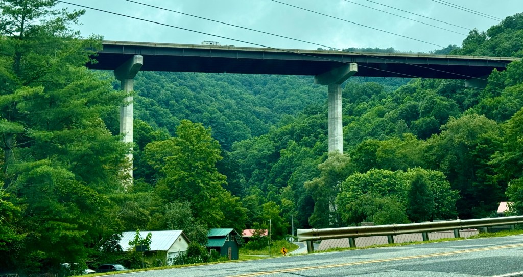 A sign of this was Interstate 26 which crossed our road far above us. The traffic that used to come along the road that we were driving along, the old main twisty road from Asheville to Tennessee, has been bypassed and all the stores and restaurants that depended upon this travel have closed, except for one upscale cafe which was aimed at people like us or people from Mars Hill close by where we had delicious biscuits and gravy and blackberry jam. The Interstate gives easy access for the mountain folks living along it to the outside world, but it is also as if the outside world is passing these people by. And they don’t like it.