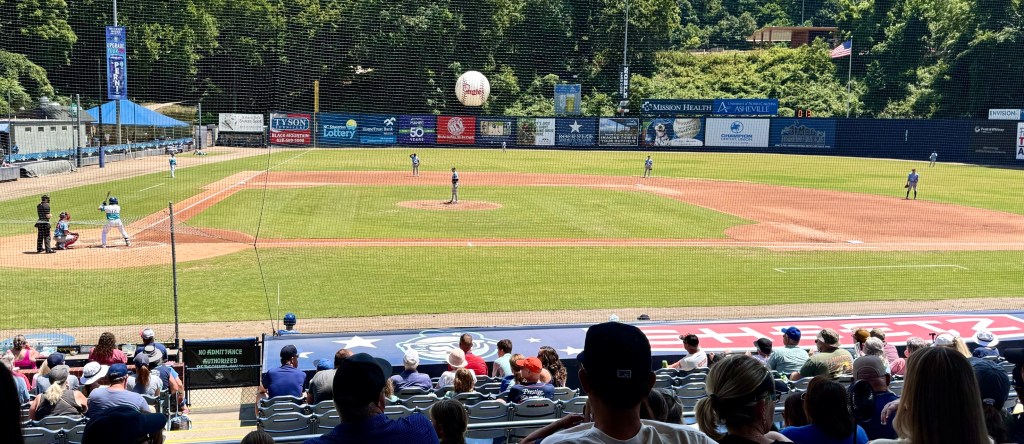 Today I went with my son-in=law Todd and our mutual friend Randall and his son Laird and Laird’s father-in-law to the baseball game at McCormick Field in Asheville. The temperature was 85 F and almost everyone had seats in the shade.