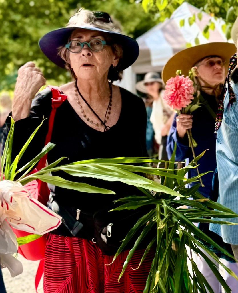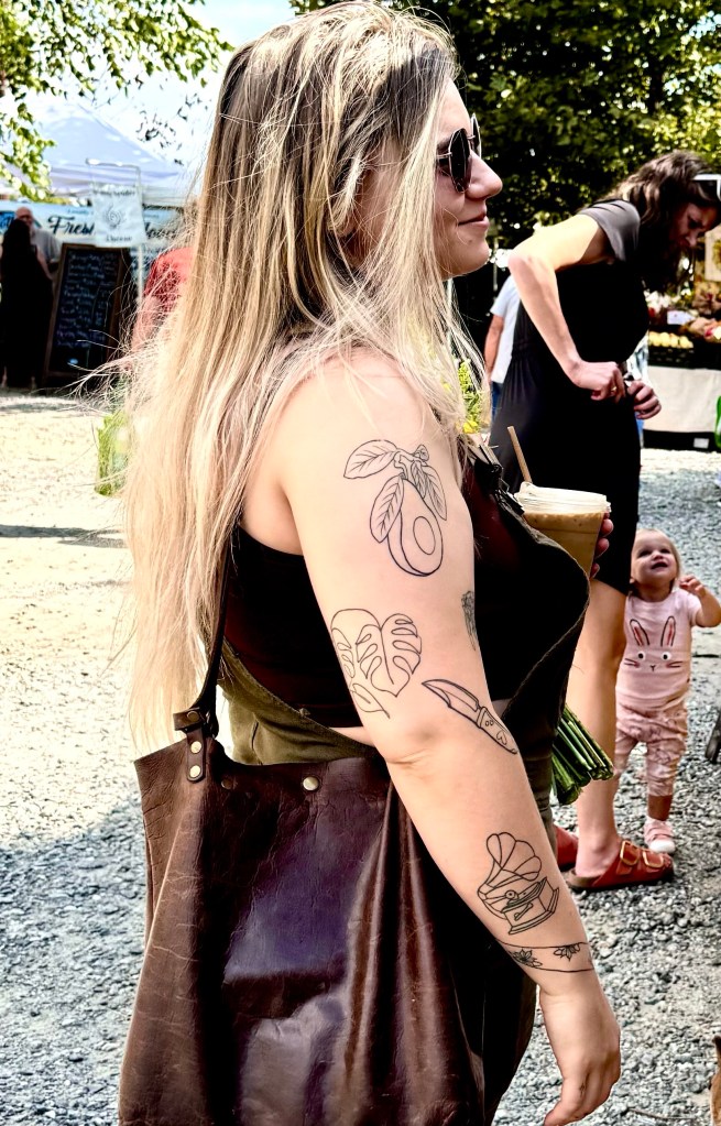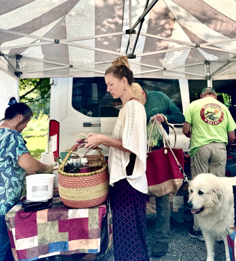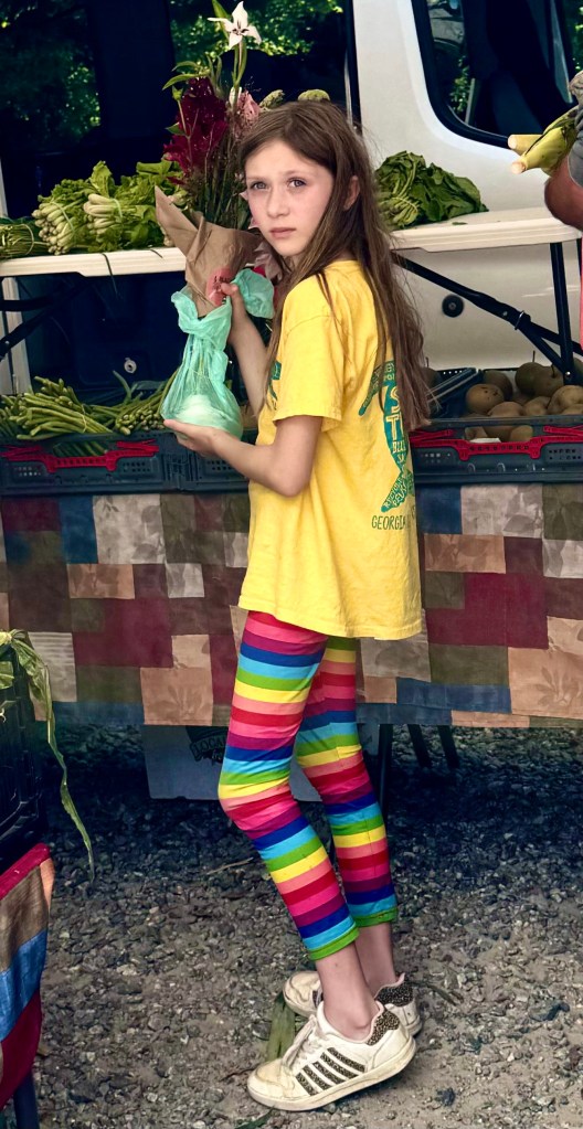 Every Wednesday there is a farmer’s market under the huge high bridge across the the French Broad river with plenty of parking and white tented booths where local farmers sell their produce. The tomatoes are juicer, blemishes and all, than those in Ingles, the giant grocery chain headquartered in Asheville and there are French pastries for sale and wonderful crusty bread along with honey and natural remedies. There is also a holiday spirit with everyone bringing their own baskets and sacks to take things home with. There are also many more tattoos, both on vendors and shoppers, than at Ingles.