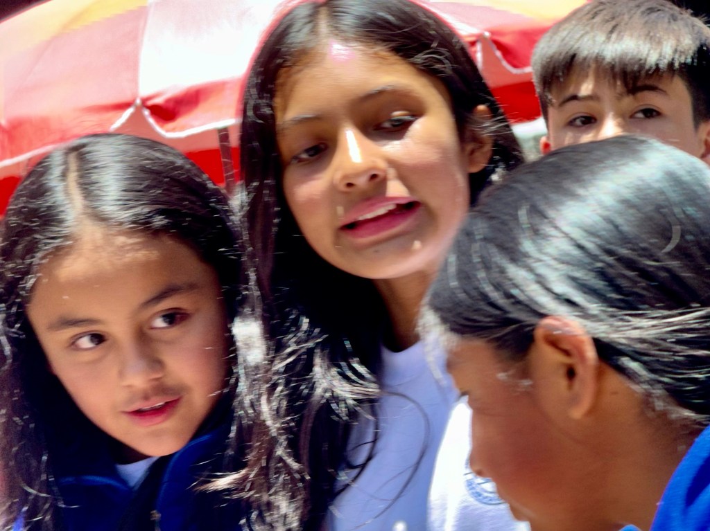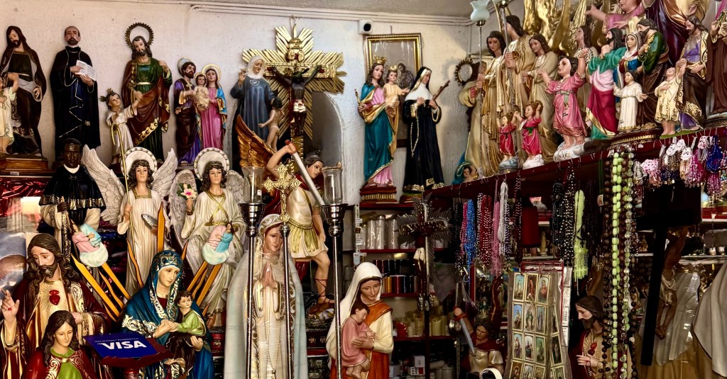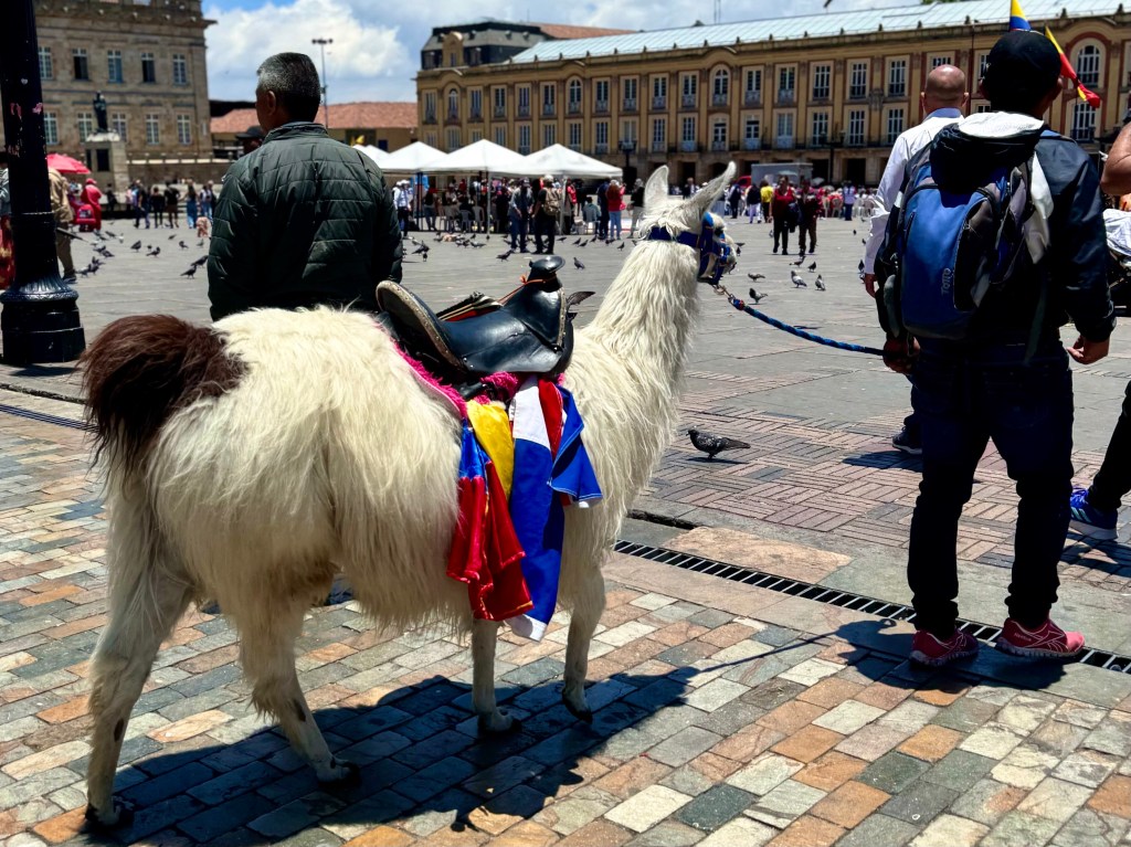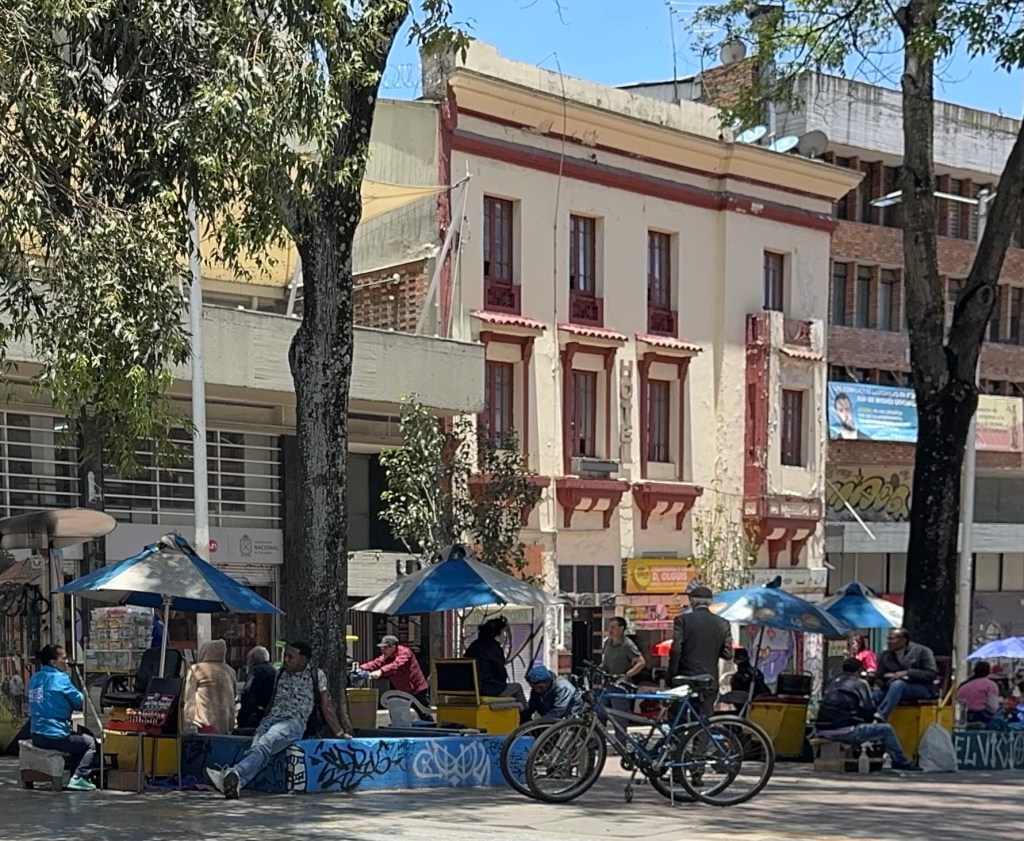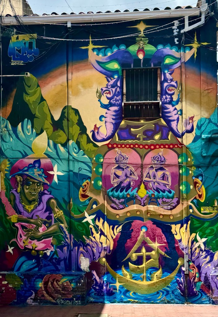 Above us three floors is a large party with a band on the rooftop with a view of all of Bogata that is shaking the glasses in our cupboard. Far below us in the street next to our building is another band filling the street with sound. Bogata rocks on Friday nights. We were told not to go out at night, but we are not even tempted, after a full day we will again go bed early and then be off to a flea market tomorrow. Yesterday the 8500 foot altitude with the Andes above us, made my 87 year old legs burn. But today I am getting used to it. The taxies helped.