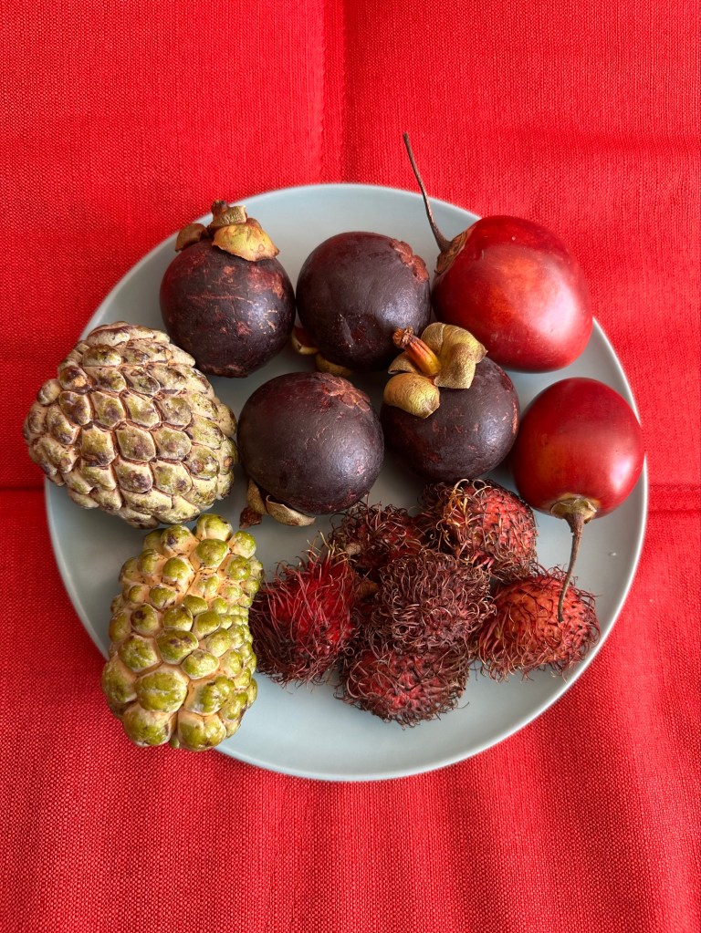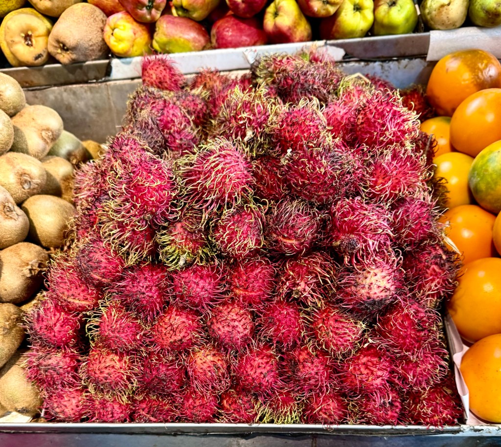 Again we walked by the street vendors for forty minutes and then took a taxi the twenty minutes to the market in very slow, stop and go traffic for only $3. In the crowded market we wandered the narrow aisles and brought fruits that we never see in Asheville—leechies, custard apples, mangosteens and something sweet and sour that looked vaguely like a tomato outside and tasted nothing like a tomato inside.