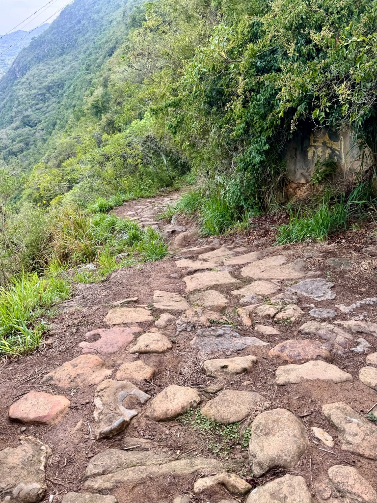 It had rained the night before and I didn’t want to slip or to trip and fall on the hard rocks as the road canted down at a sharp angle. The trail was beautiful with a view of the valley far below us but I didn’t dare look up except at rest stops at large rocks by the side of the path that seemed to have been put their for weary travelers. Climbing up the same steep path would have have been very strenuous for anyone. Even when the path leveled out for the last two miles it dipped in a number ravines and then climbed again over a ridge, rising for hundreds of feet which I plodded up step by step.