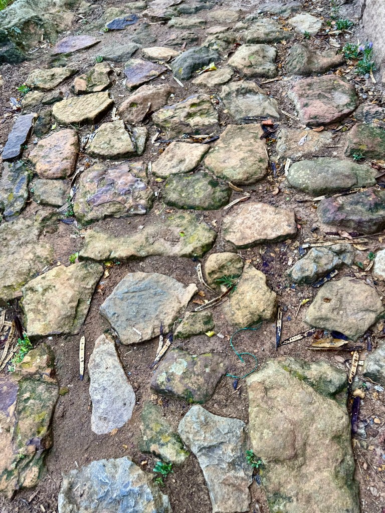 The trail was paved long ago with rounded rocks but rain had washed out the spaces between the rocks making the road very rough so that every step was treacherous.