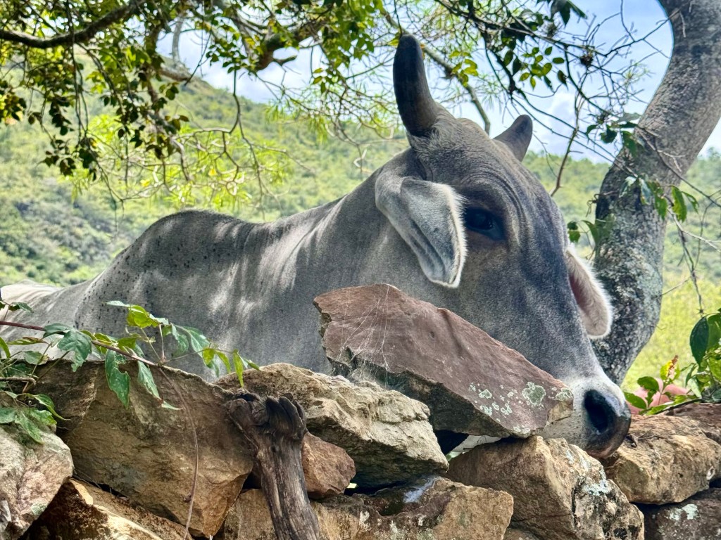 I do have a photograph of an Indian brahma cow, looking exactly like the Gujurat cows I had seen in India months ago, looking curiously over a stone wall at me as if concerned whether I was going to make it or not.