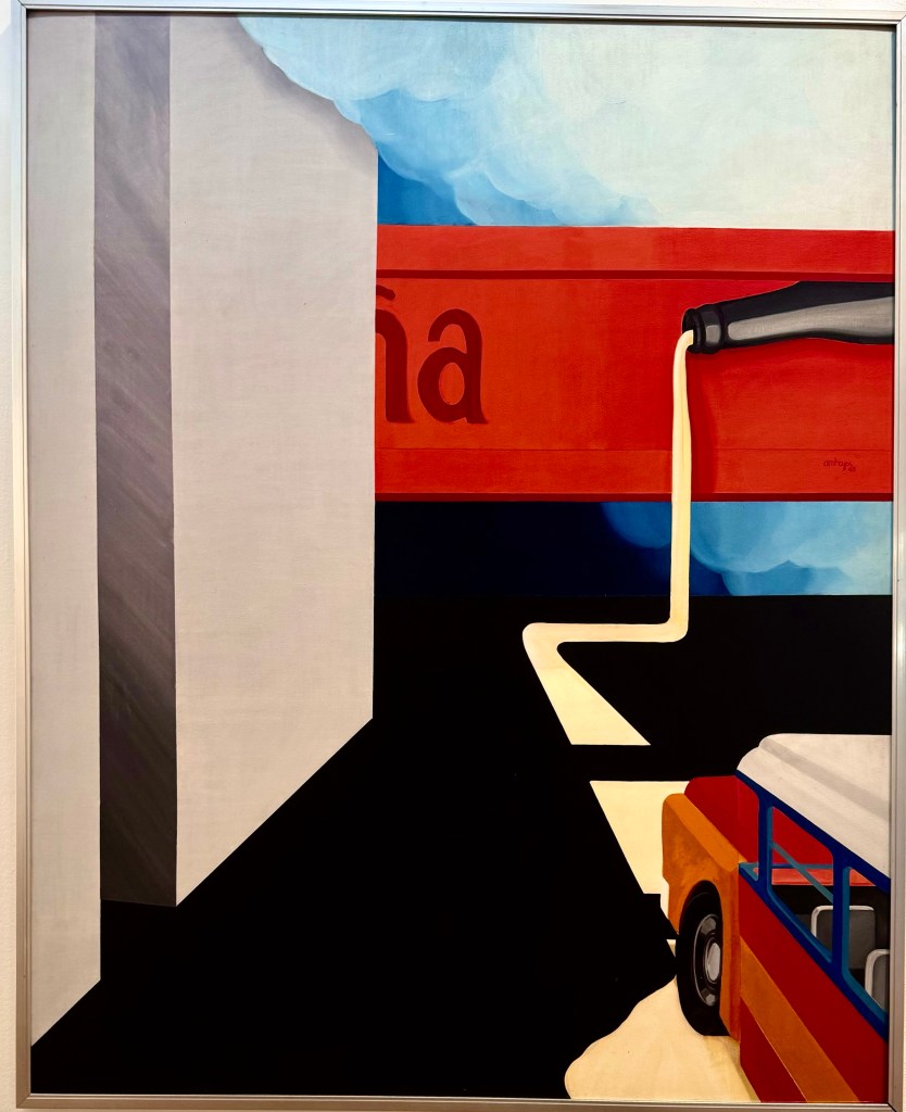 After talking with Sanchez I walked through the flea market to the next door Museum of Modern Art ($3) where I sat for a while in their very nice cafe eating a sumptuous banana split and drinking a glass of fresh juice. And then I looked through the two main exhibits, both by women, one an abstract painter of bright rectangular paintings and the other a Lithuanian/Colombian artist who was interested in primitive art.