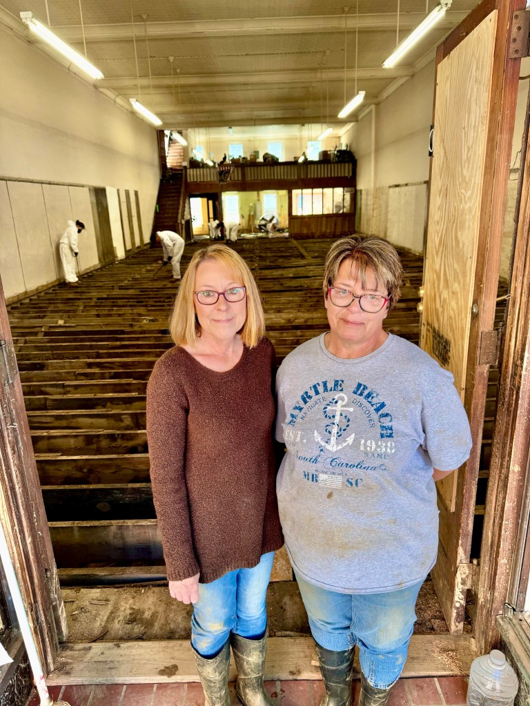 First I looked in at Penland’s, the old fashioned general purpose store on Main Street, where fresh produce was sold in front and everything else behind, where I had bought sweet sorghum syrup. The two sister owners let me photograph them in the doorway of building where workers in hazmat suits were hard at work stripping the floor above the flooded basement.