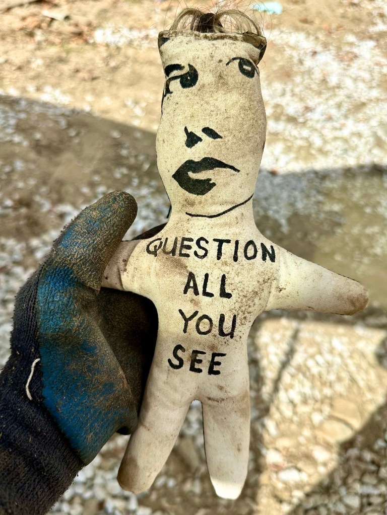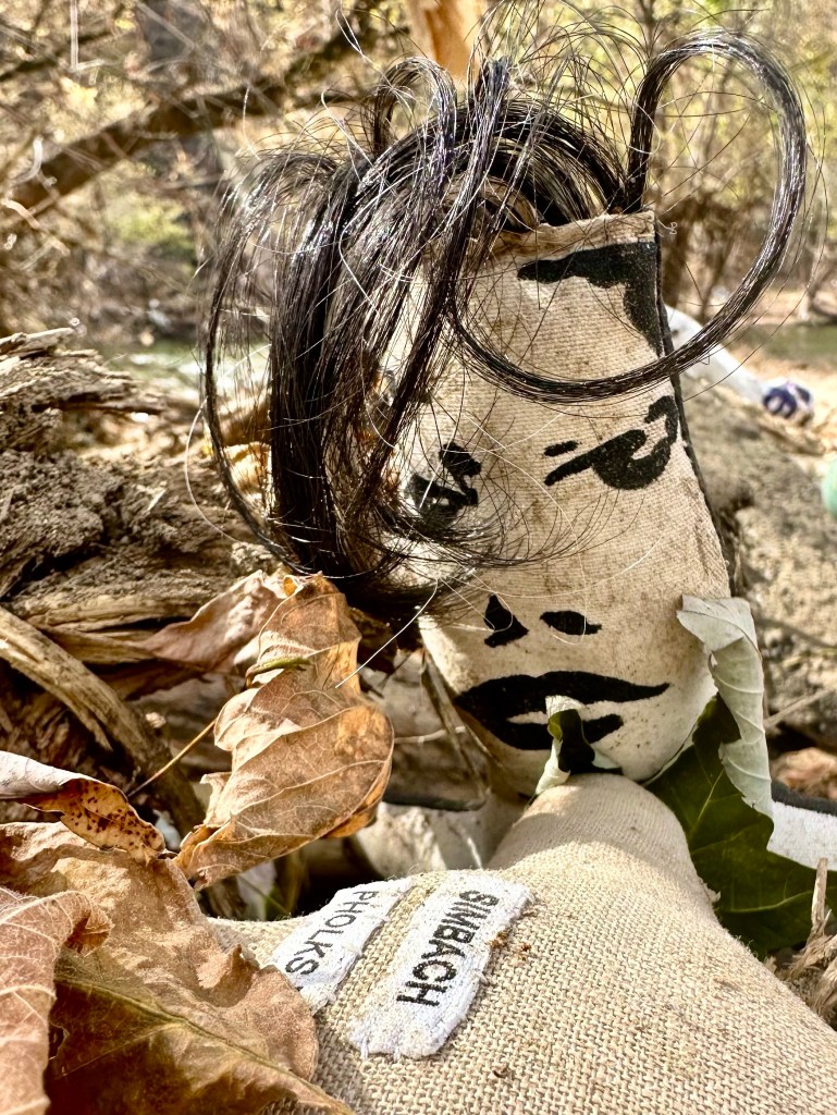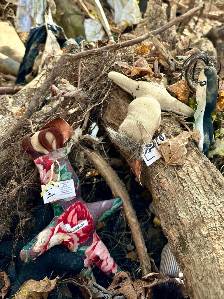 The day after Halloween Susie took a bag with her on a walk along the French Broad River in Marshall. She was hoping to find objects with which she could make an installation of objects as a response to the terrible flooding that had happened. There were huge piles of debris twenty feet high along the river that she inspected for objects. In one huge pile she found a little cloth doll and a ripped up box that had sheets of paper with hand writing. Then she found another doll, and another and finally realized that all of these objects had come from the house of Lois Simbach, fashion designer and artist, whose entire house and studio at the upstream end of Marshall had been washed half a mile to this pile.