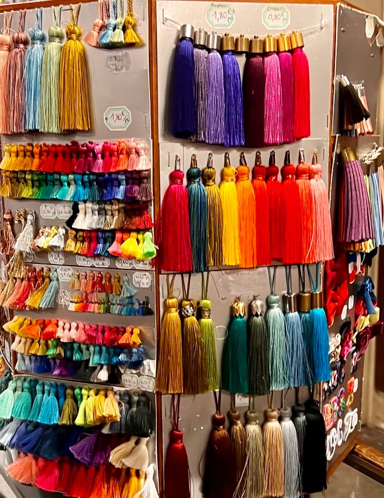 A high point of our visit to Paris was an hour’s long visit to Ultramod, a magical old fashioned haberdashery filled with ribbons and buttons and skeins of yarn and fancy hat with a sister store Mercerie across the street. Three years ago when Susie and I were in Paris for a month we visited Ultramod again in memory of Kathe. And I have recommended it to other people.