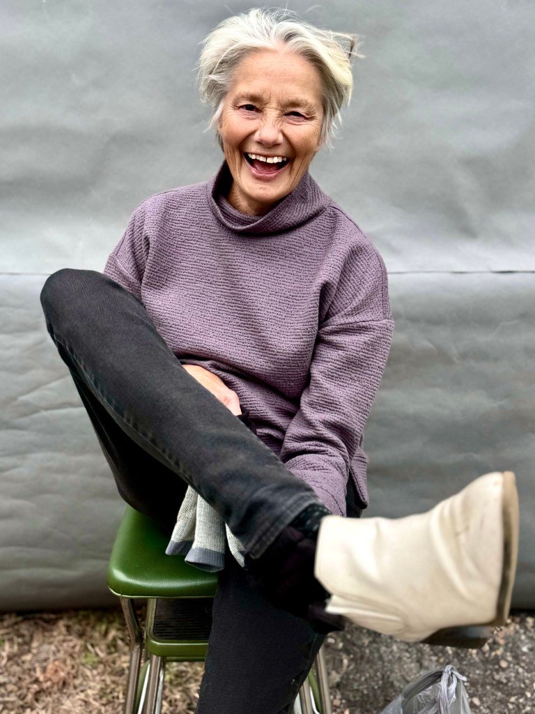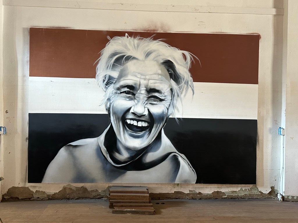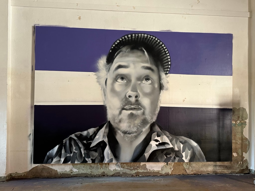 Today Susie visit Marshall where she has her studio and discovered these 10×10 foot murals, large paintings, in the shell of the flooded Madison County Arts Center where the floors and walls have been stripped. The murals have been made by a visiting artist. And one of them, of Lois Simbach, was made using a photograph that I took with my iPhone of her weeks ago at the Nanostead staging area for volunteers who were cleaning up Marshall. Pretty neat.