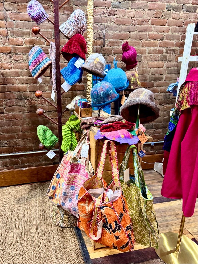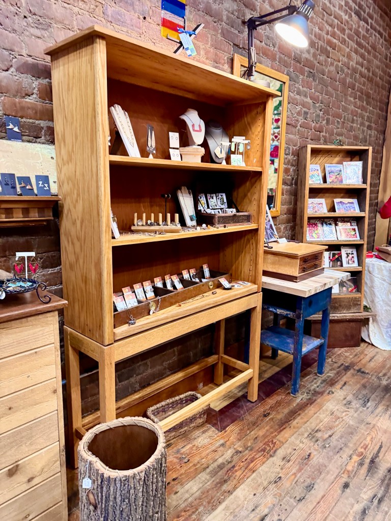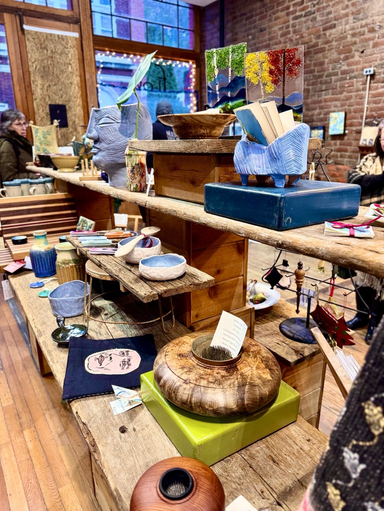 Flow is an artist own store with a bright red door and window frames where my wife Kathe used to sell hand made hats and other objects. Mud filled it after Helene, but now parts of the floor and the walls and the windows have been replaced and on a cold Saturday night the artist owners had assembled a pop up store or hand made Christmas gifts and had a sale with hot cider served. The little store, with much refitting still to be done was filled with people and business was brisk. Flow and Marshall were back in business