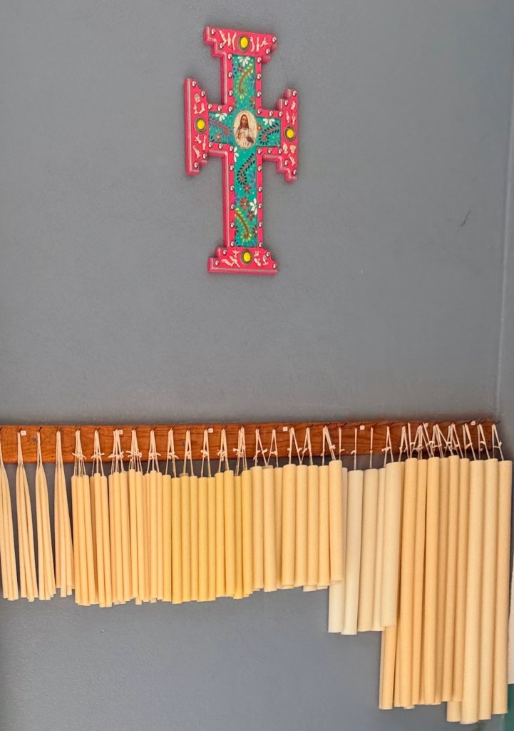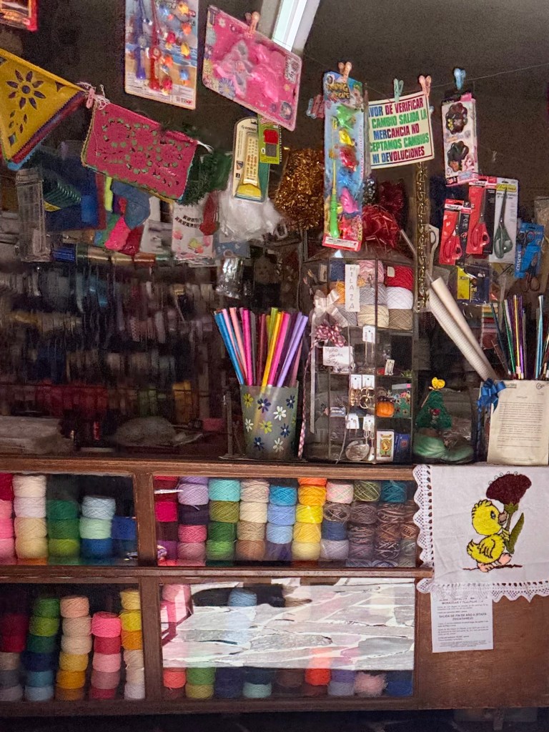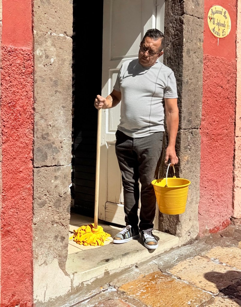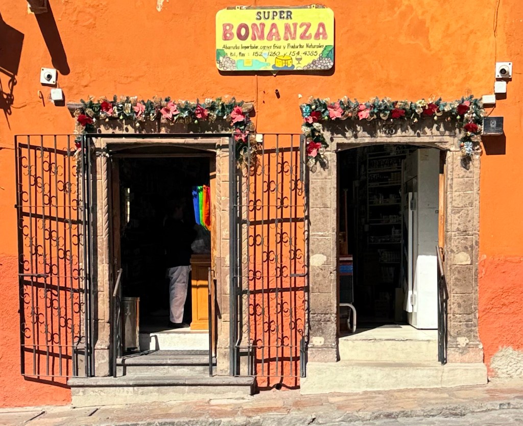 After the meeting at La Cabre Illuminada Martha went grocery shopping for supplies to be ready when her first group of 15 arrives on Tuesday. The dry goods shop, Super Bonanza, where she shopped for nuts and grains had a narrow store front, maybe 20 feet wide but stretched back through narrow extension after extension with narrow aisles. It was as unlike a Swannanoa Ingles grocery store as could be. I am guessing there must be big box stores somewhere in Mexico and large grocery stores with multiple varieties of the same things as there were at times in Greece and Colombia, but in the old town of San Miguel with it multicolored buildings there is almost no compromise with modernity.