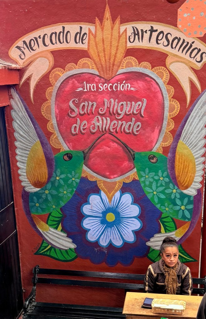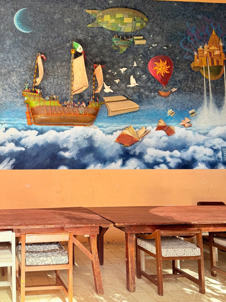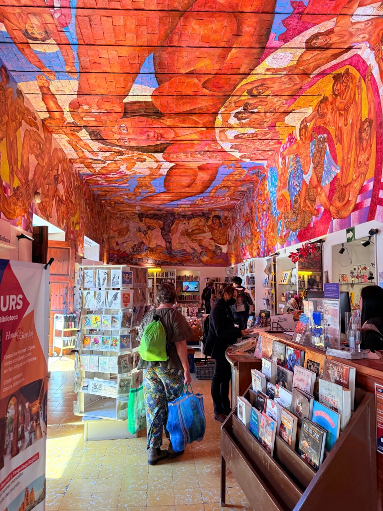 The food was terrific. Then we went through the library around a large courtyard, again protected by a cloth covering. It is a very inviting place with a used bookstore and craft shop under an brightly colored meural painted ceiling. In one corner was a booth where you could buy tickets for a number of tours to tourist attractions.