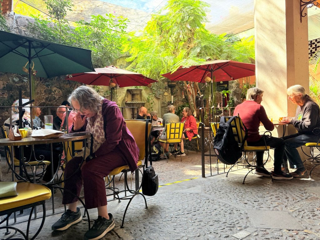 The courtyard restaurant among small trees covered with a cloth cover to keep ou the birds was filled with expats.